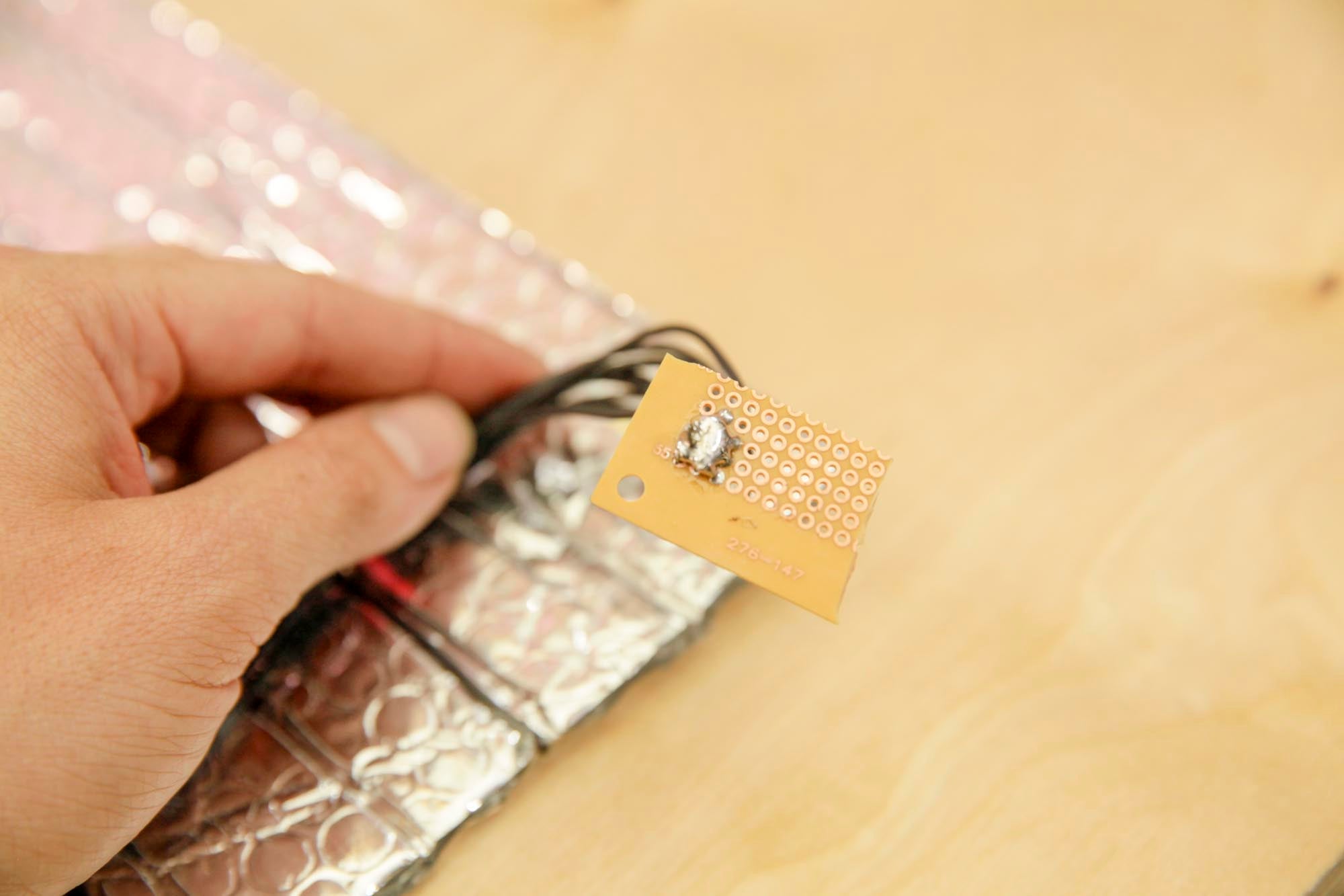 I set my soldering iron just hot enough to melt the solder, but not so hot that it would burn the plastic or mylar foil while I was making the connection. If you're soldering iron doesn't have variable heat, you may want to complete this step before attaching the strips.
