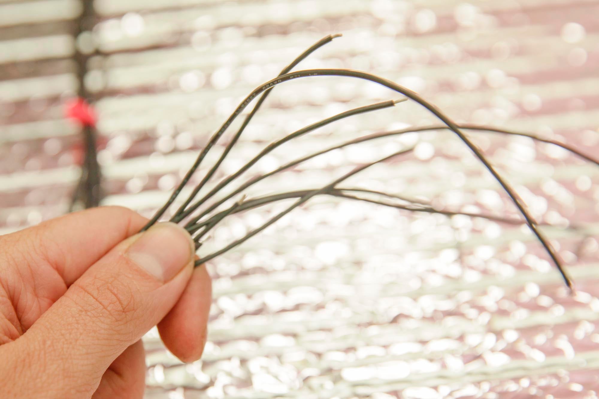 Using trusty masking tape and clear packing tape, I was able to come up with a pretty clever solution. I just folded the wires back over the other side of the insulation, 'pinned' them with masking tape, and then secured them with 2" clear packing tape. It's hard to tell it's there in the photos, but I promise, it is.