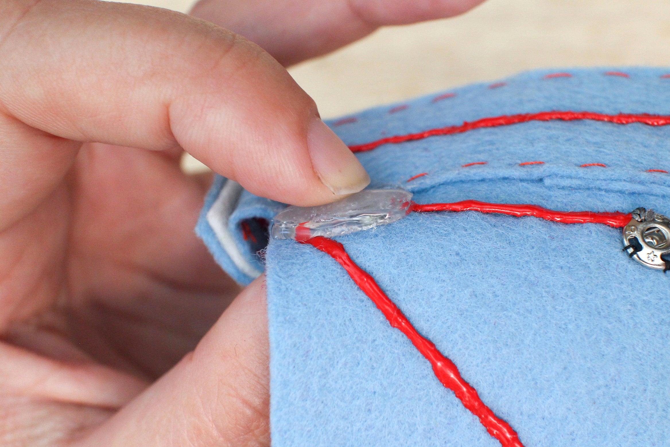 Heat up the hot glue gun and put a layer of glue on the felt around the board. One layer should do it. Once the glue hardens, put another thin layer of hot glue down.