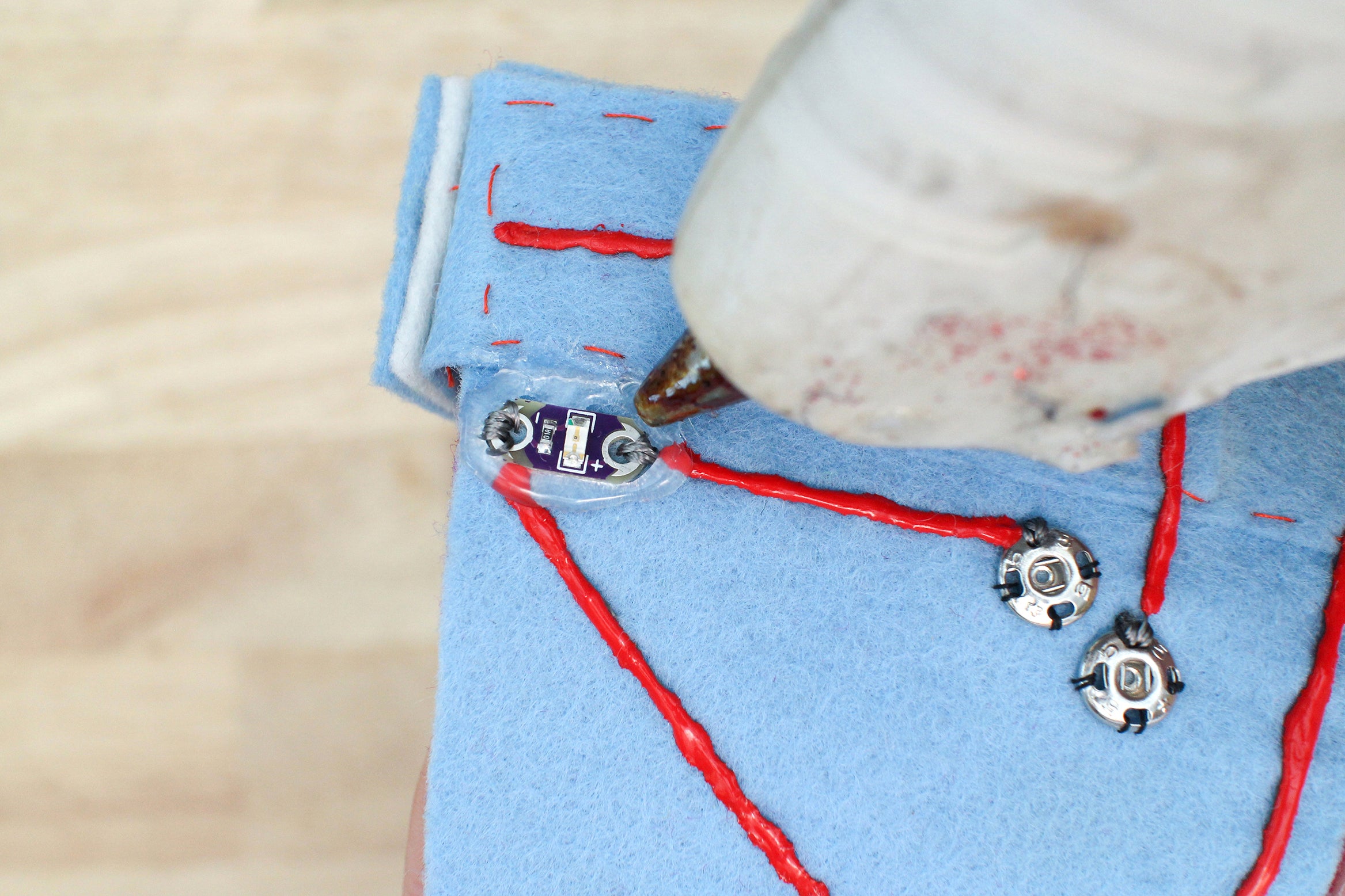 You have now covered the front of the circuit, but when using conductive thread you also need to address the back of the circuit where the stitches may have poked through. At this point, the knots are already covered with glue, but if any stitches broke out to the other side you may need to cover those.
