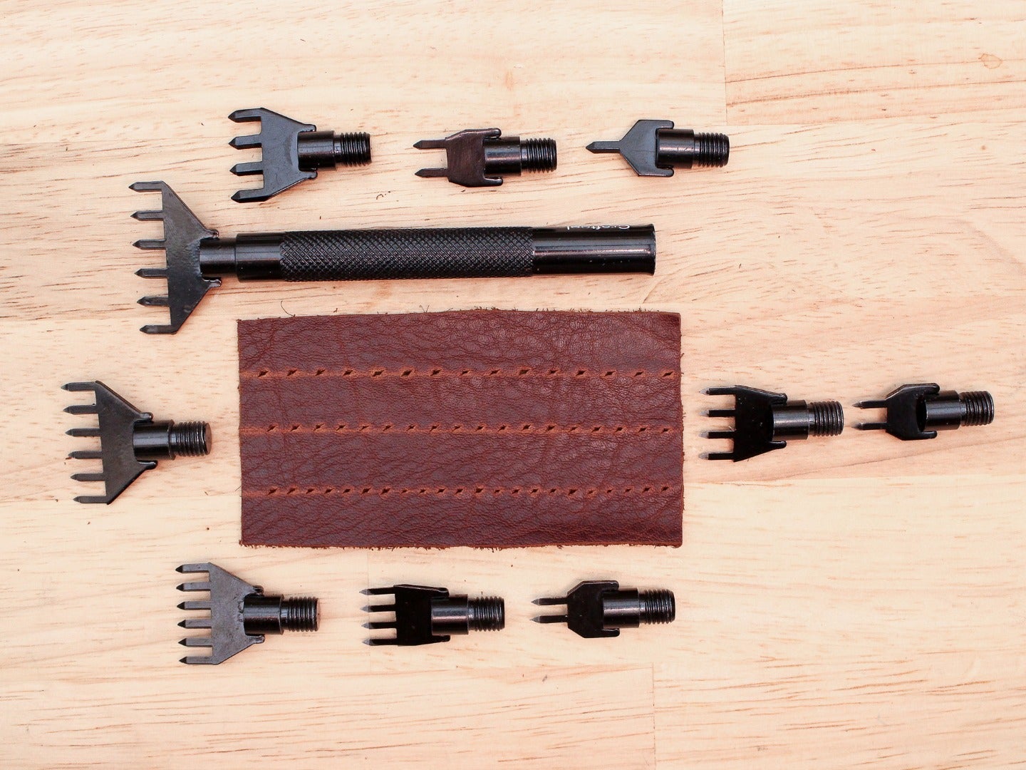 The stitching chisel is a more efficient way to create sewing holes because you can punch a few at once. You can also skip the step of marking with the overstitch wheel because the stitching chisel automatically creates evenly spaced holes. Stitching chisels also come with different prong spacing to create smaller and larger stitches. I like the set I have because it comes with three differently spaced sets of prongs.