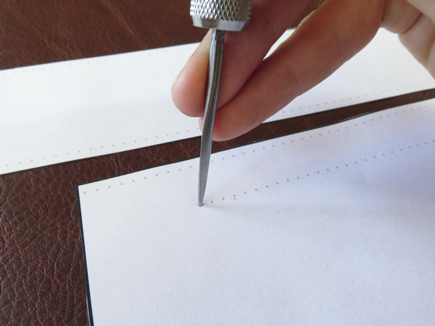 Mark your pattern edges, rivet holes, and the ends of sewing lines, with an awl.