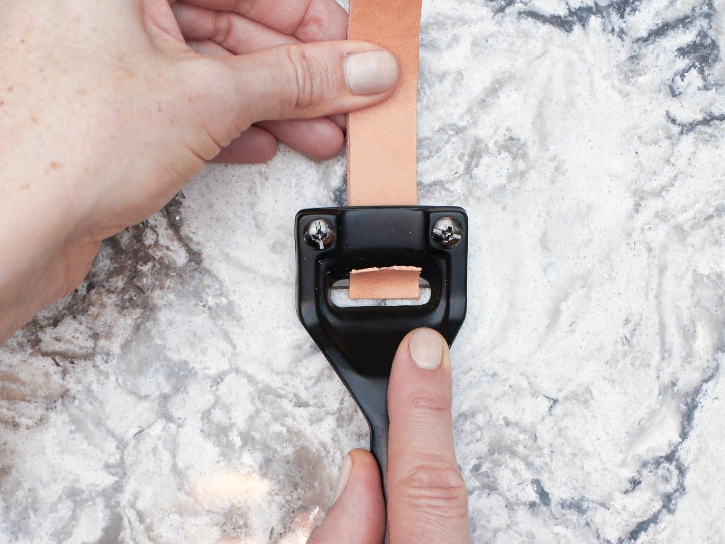 The Super Skiver is a skiving tool that basically works like a razor, and even comes with replaceable blades. You pull it along your leather to shave away layers you wish to remove. Pulling your skiver parallel to the edge you want to skive is usually the best method when you are skiving a relatively long edge. To do this, place your leather on a hard surface like your quartz slab. Line the edge you want to skive up with the edge of the quartz, about 1/6" from the edge. Then start pulling your skiver along the leather, shaving off an angled strip. It usually works best to start skiving a little ways in from the end of the leather, finish the skive, and then turn the leather around to skive the bit you missed at the beginning.