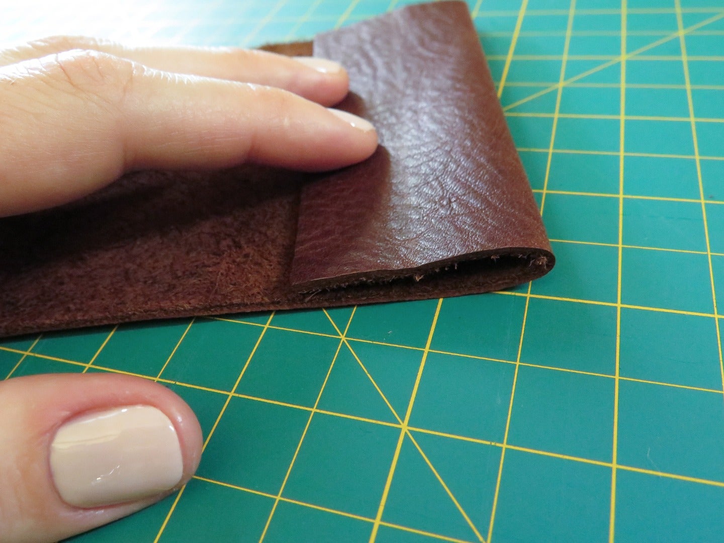 Make sure you've tested your V-gouge on a scrap of your leather before you gouge the lines on your actual pocket. Remember, you want to gouge deep enough so you can feel the leather fold easily, but not so deep that you come close to breaking through the grain side of the leather. When you think you've gotten the hang of using this tool, gouge the 4 lines on the back of your pocket. Now fold the edge of your leather over on one of the inner lines so the grain sides press together.