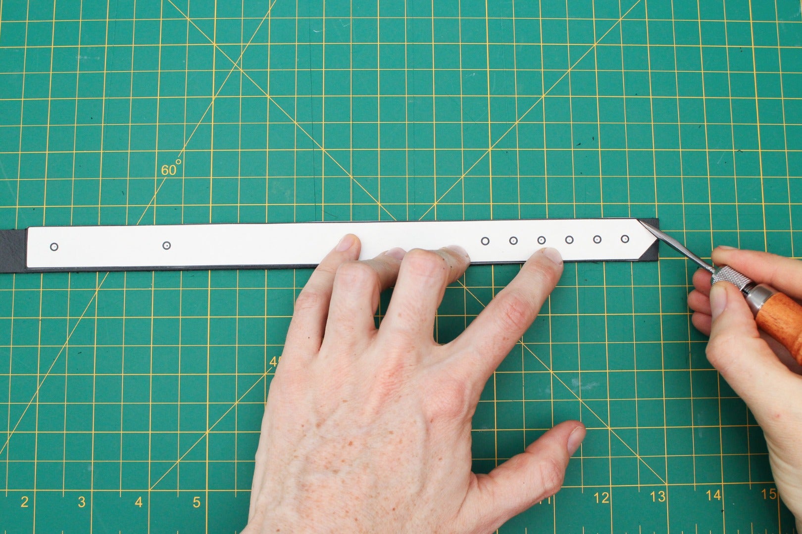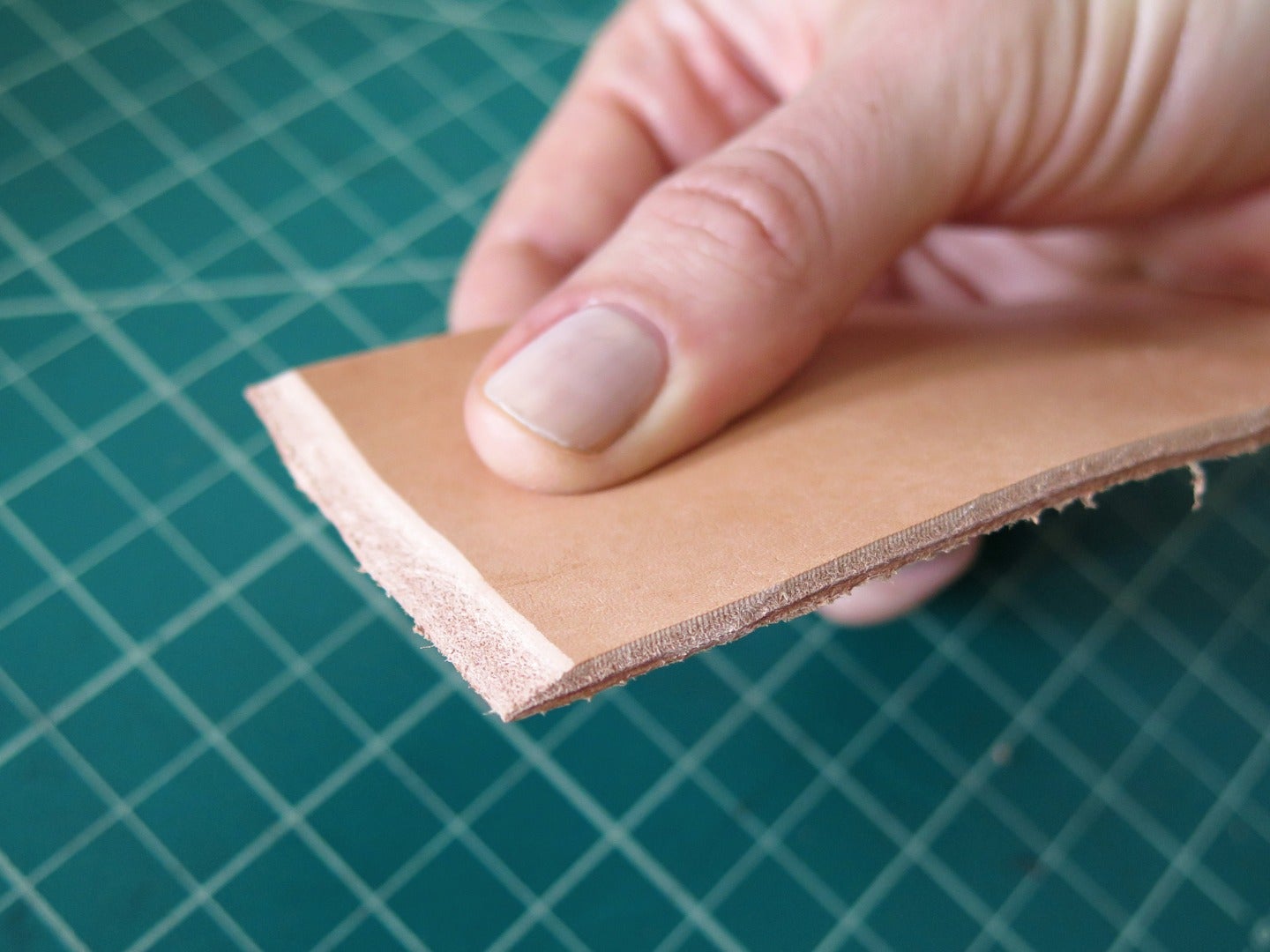 If you find it hard to maintain an even angle, you can try drawing a guide line on your leather where you want the bevel of your skive to start, and then follow this line as you pull the skiver toward you.