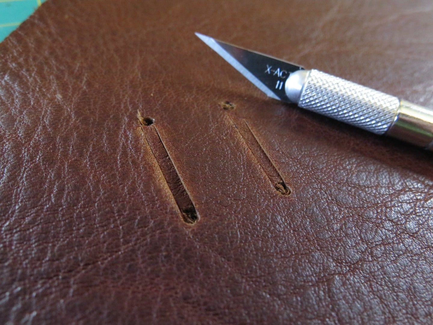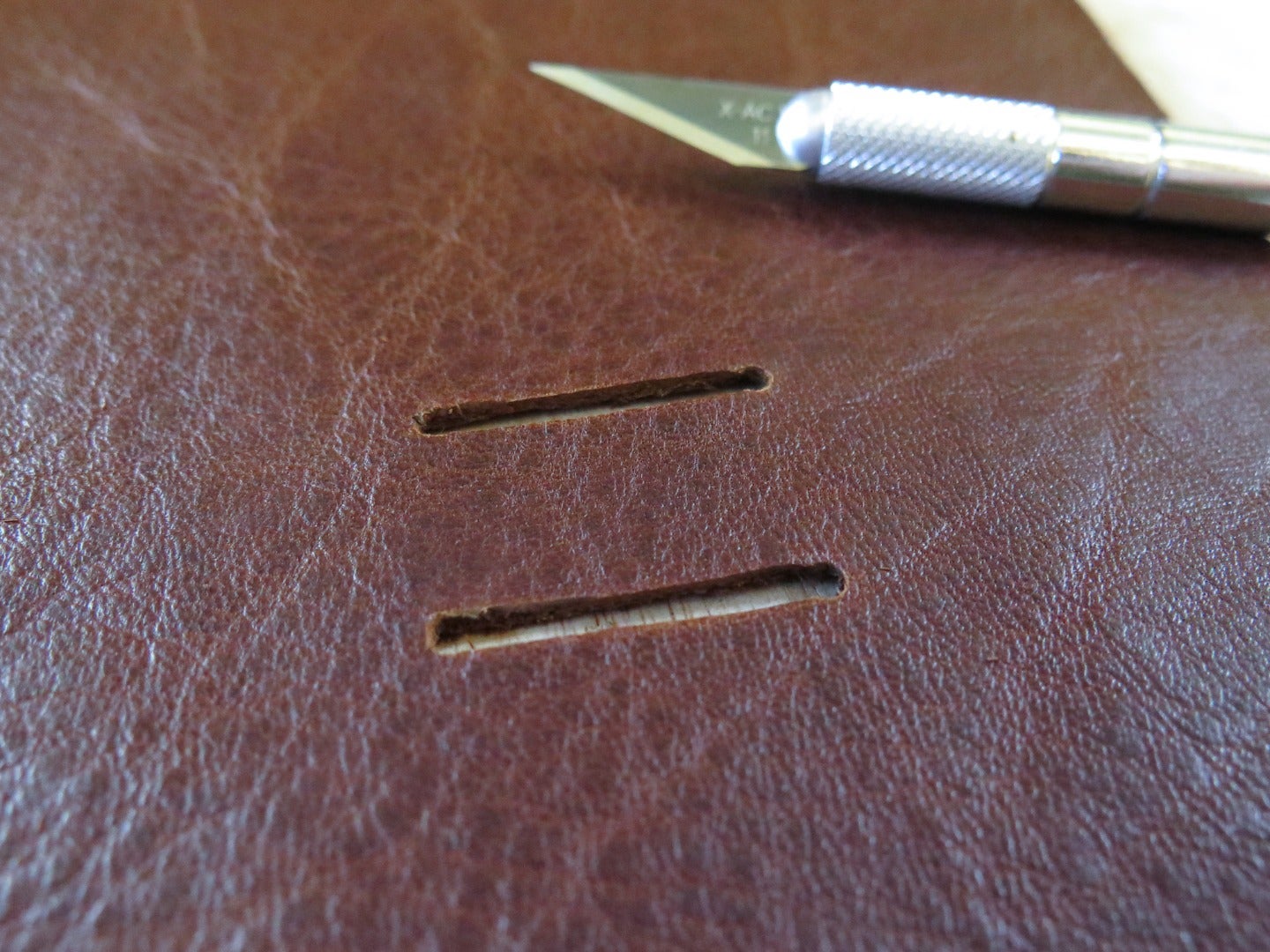 An x-acto knife can also work as a skiver in a pinch, especially on strap ends. Start your skive by placing the blade of the knife where you want your skive bevel to start and pushing away from you towards the strap end.