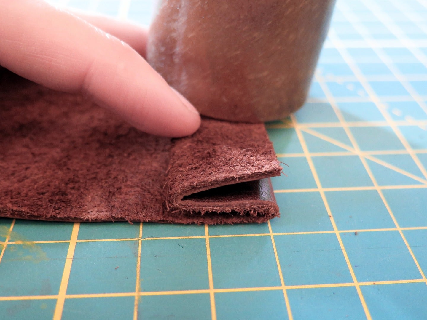 Use the cardboard and mallet trick to pound a crease into the leather along the gouged line. Then fold the edge back along the second line, and pound this fold down on the flesh side, creating a fold like an accordion.
