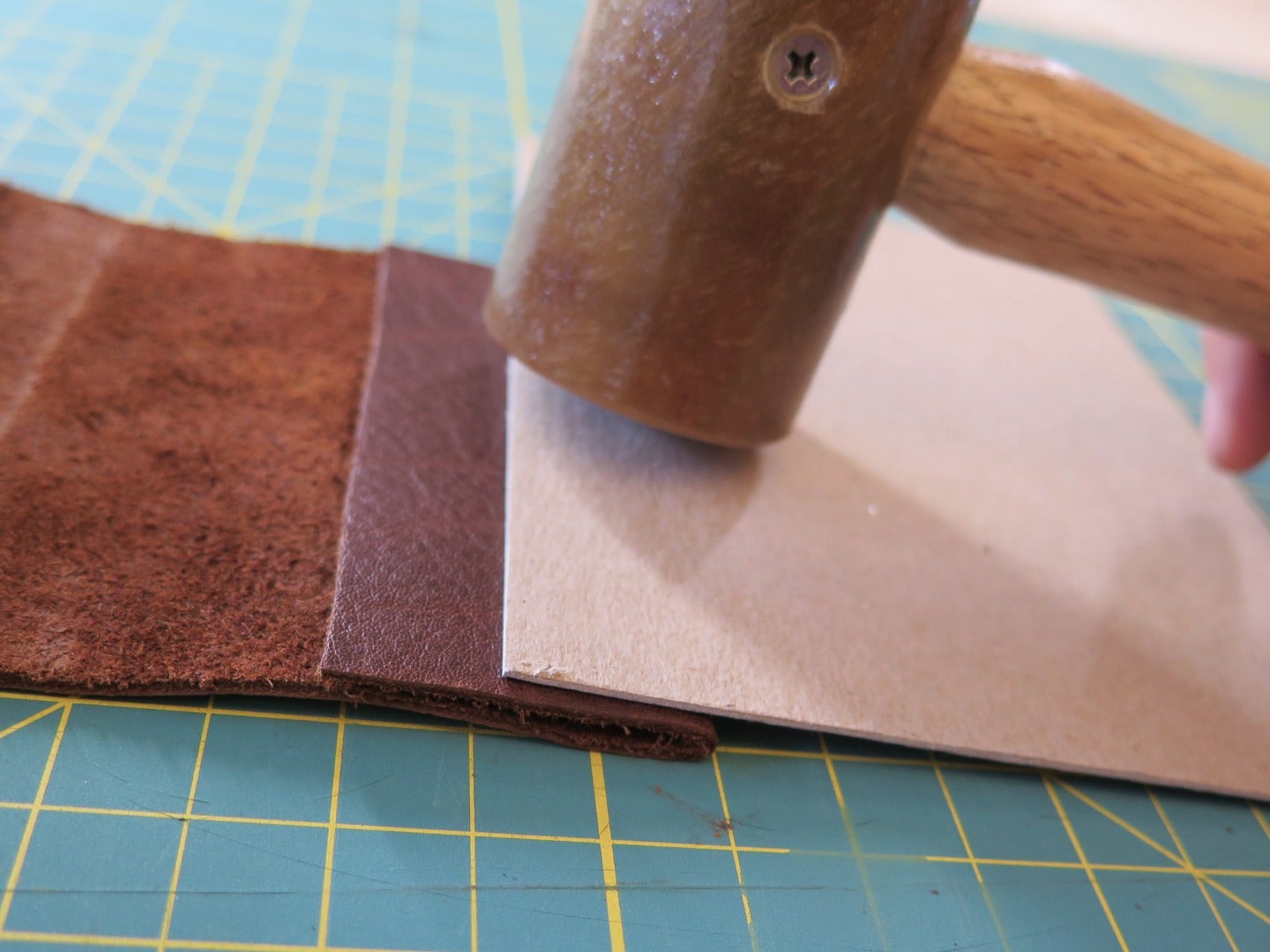 When you are layering several pieces of leather on top of each other, as you do in seams or riveted loops, you sometimes need to thin the edges of the leather pieces so they stack together cleanly. Thinning leather pieces like this, by creating a long tapered bevel along the edge, is called skiving. There are a few different tools you can use for skiving, but I'm just going to show you my favorite, which I think is also the easiest and safest.
