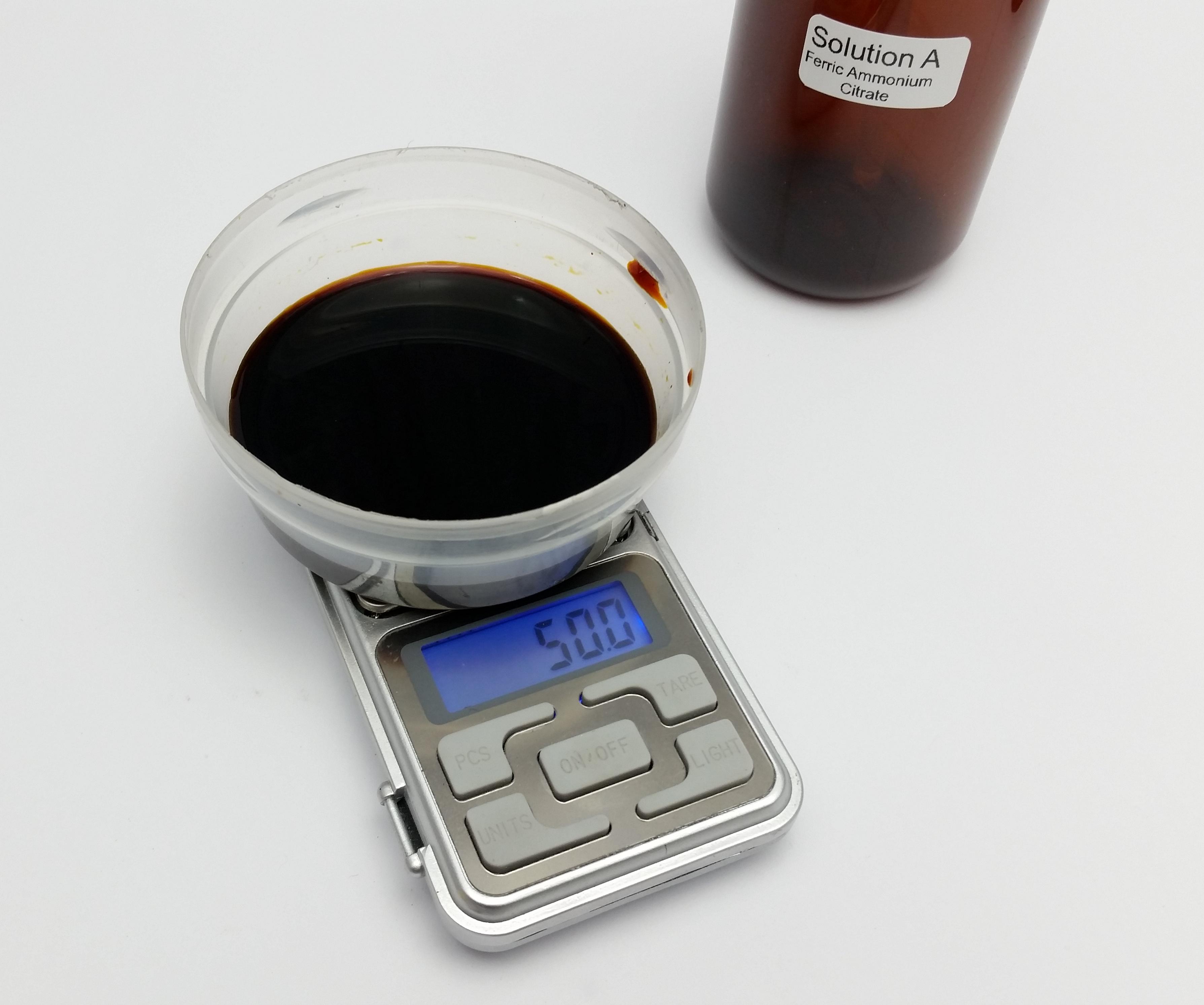 Cyanotype mixtures are very forgiving and can be experimented with to give the results you are after, as you can see in the picture the ferric ammonium citrate I used is the brown variant while this still works perfectly well it does increase the exposure time and leaves a yellow tint behind after developing which I don't mind but ideally you want to look for the "green" variant.
