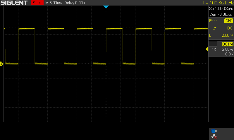 What you can see here is the output voltage of this circuit at an input step frequency of 100kHz and with a constant direction signal. In this picture everything is fine. The amplitude goes from 0 to 5V and from 0 to -5 . Also the voltages are aligned probably.