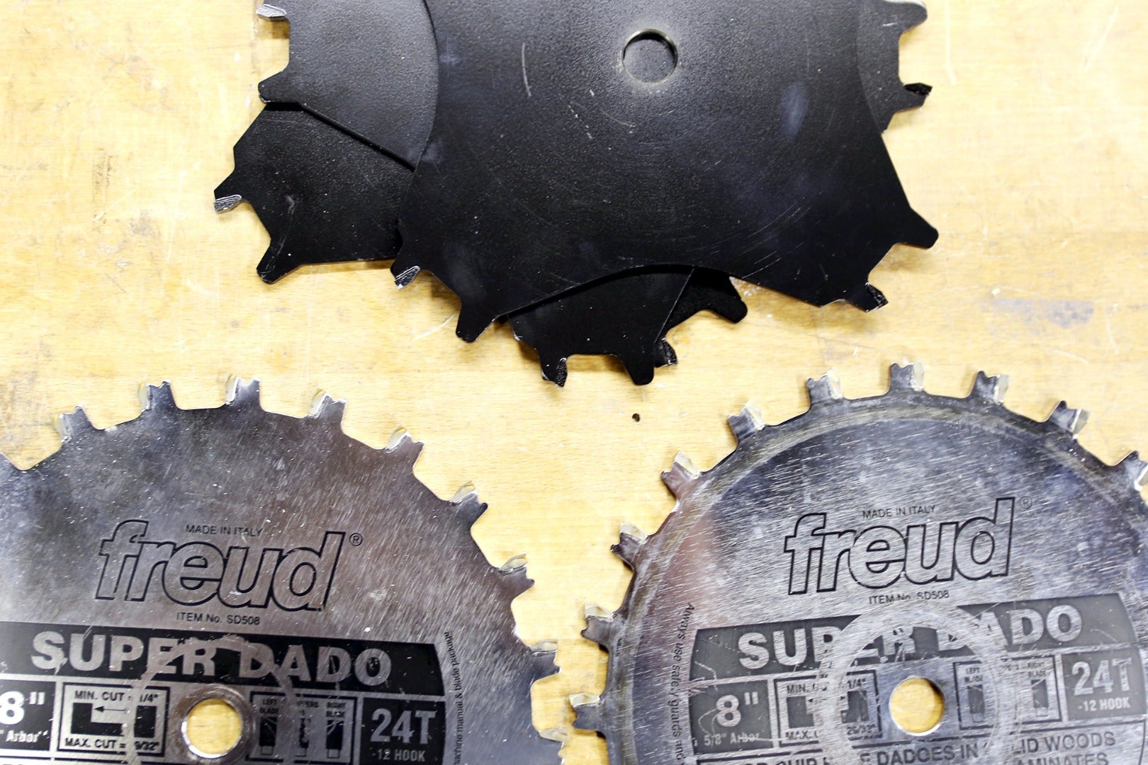 A dado stack is built by you and can be a variety of thicknesses. As the name suggests, a dado stack is a series of blades stacked on top of each other until the desired thickness of the dado is achieved. At minimum, a dado stack will contain two end saw blades. The orientation of these blades is important, as the teeth on them are slightly angled inward. When stacked, the high point of the saw blade tooth should be on the outside of the stack.
