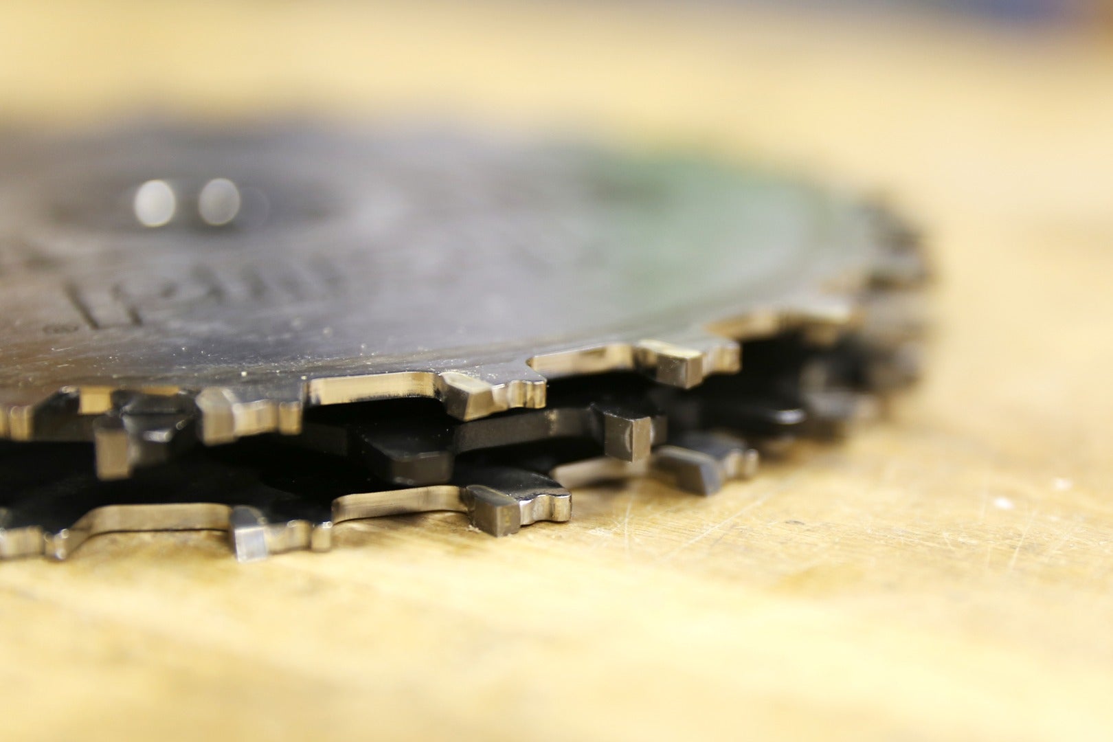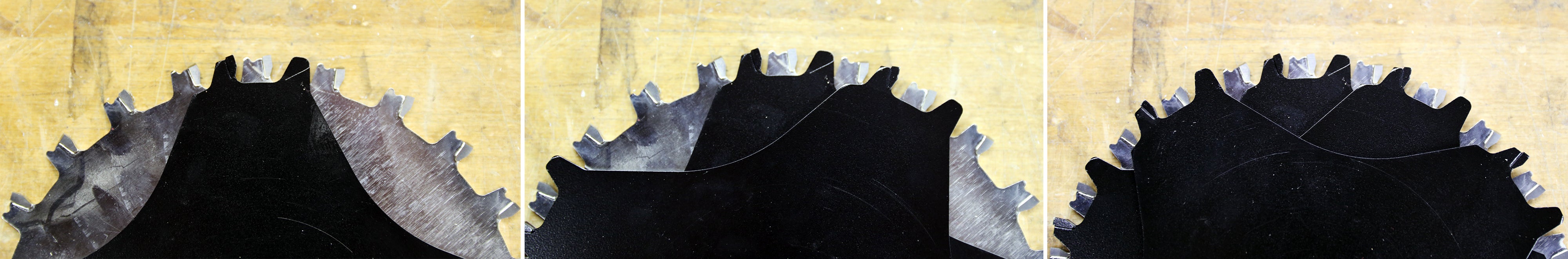 Here is a completed stack. The blade teeth in the stack are not overlapping, and the end blades are placed so the beveled teeth of the blade are angled outward.
