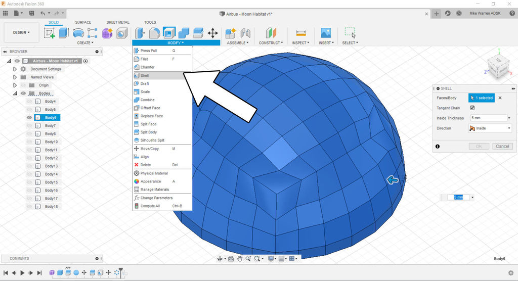 Now that there is a half sphere we need to make it hollow. To do this head to modify > shell to make a shell of the body. Define the thickness of the shell by specifying the wall thickness. I used 5mm.
