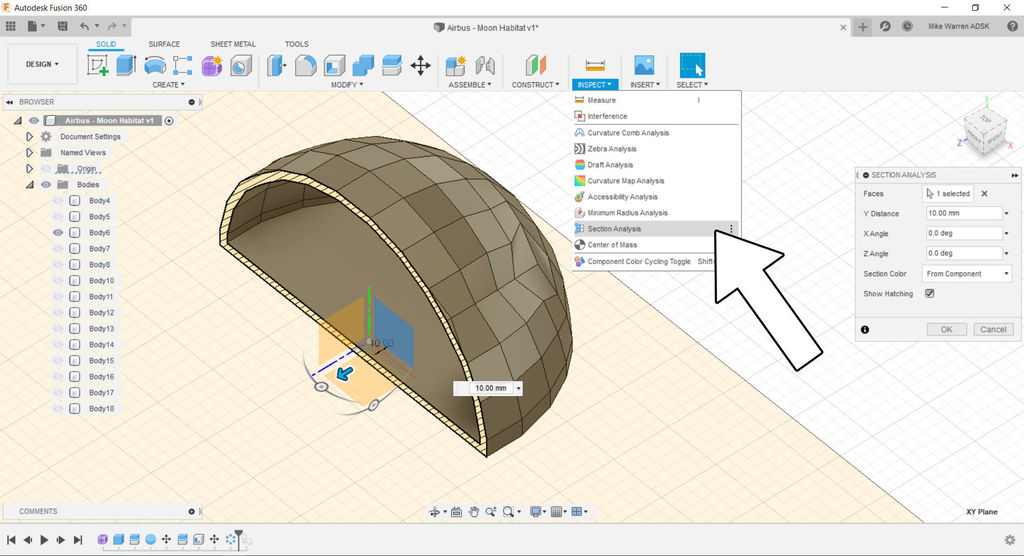 To check, find inspect > section analysis and chose a work plane to slice through. Click on one of the wall workplanes to bisect the body and see inside. Click OK to go back to the model environment when you are done.