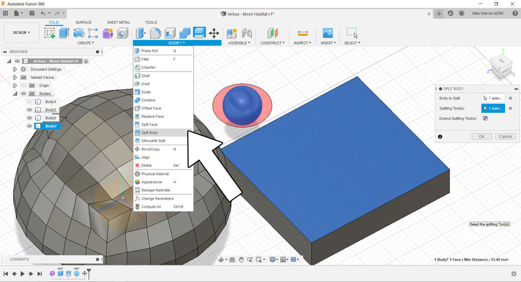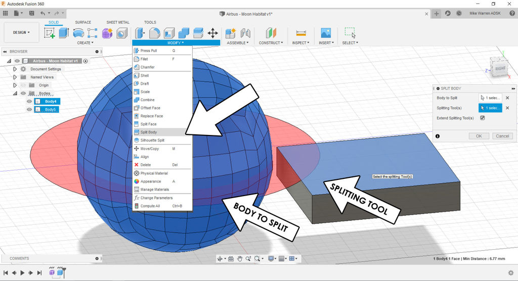 Now to use the new box shape to slice the sphere in half. Use modify > split body to open the menu. Select the sphere as the body to split and the top of the box shape as the splitting body. Make sure extend splitting tool(s) is checked. Click OK to finish the command.