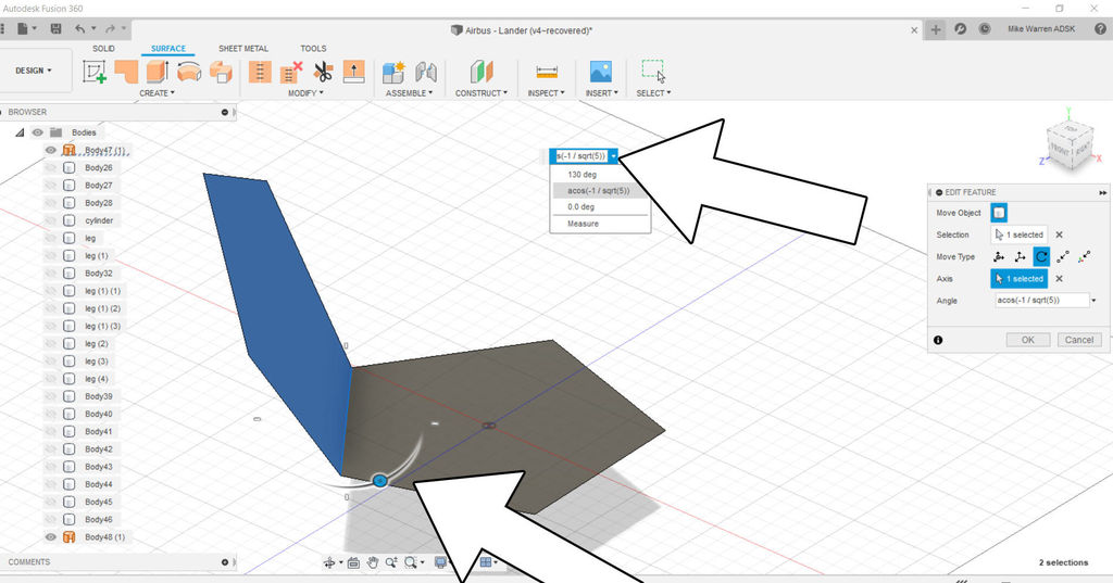 When you pick a side to rotate around a handle will appear and allow you to manually rotate the piece as you like. Instead of eyeballing the placement or using a numerical value, we will use a formula to get this exactly right. In the text field that appears when you try to rotate, enter this formula: