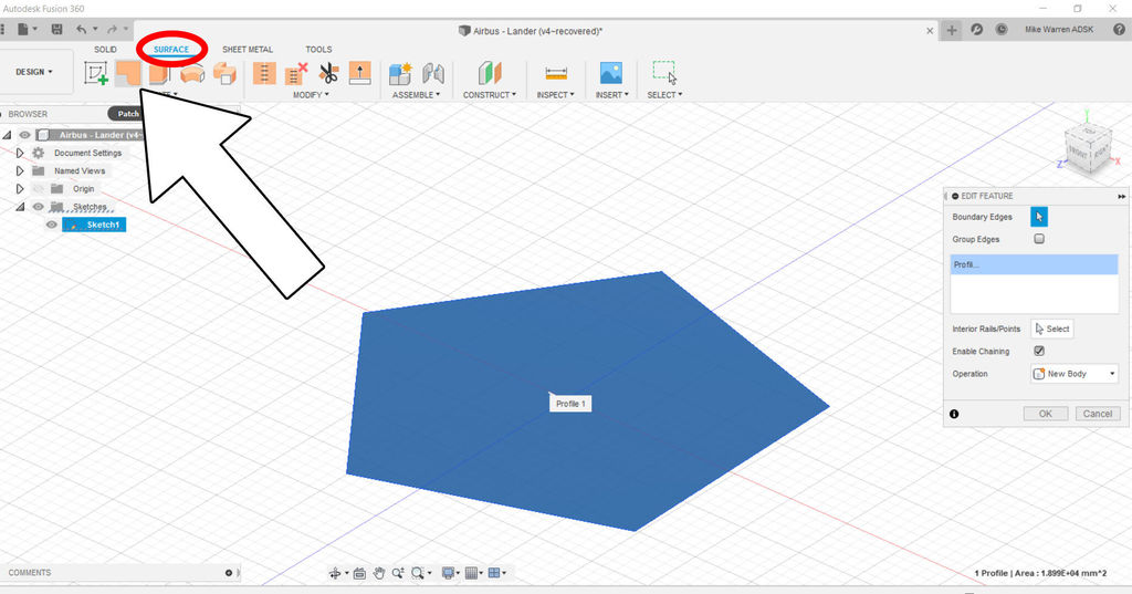 From the top tool ribbon find the surfaces tab and switch over to it, then click on the patch icon to patch our sketch into a surface we can edit.
