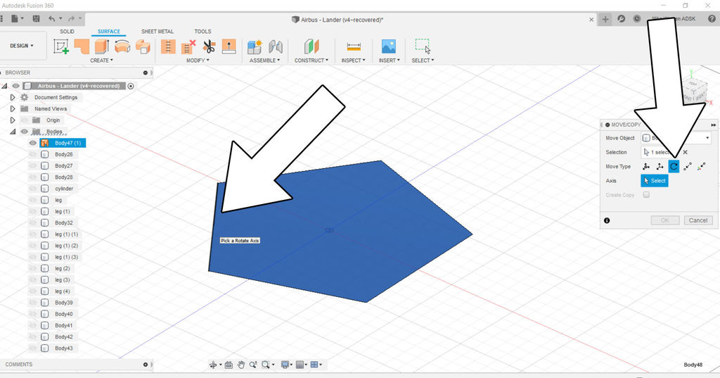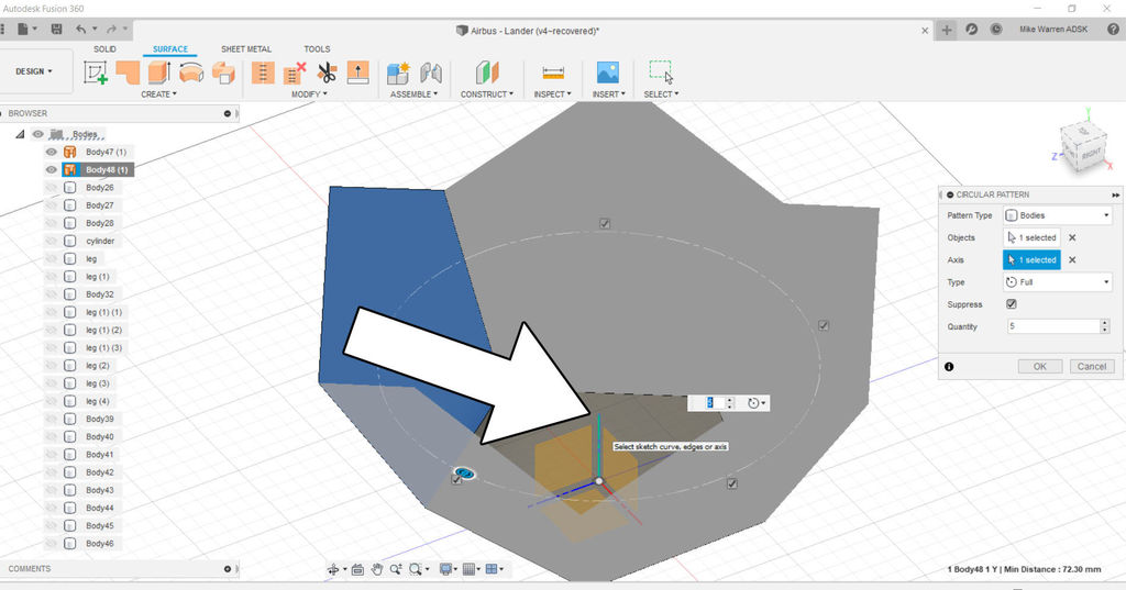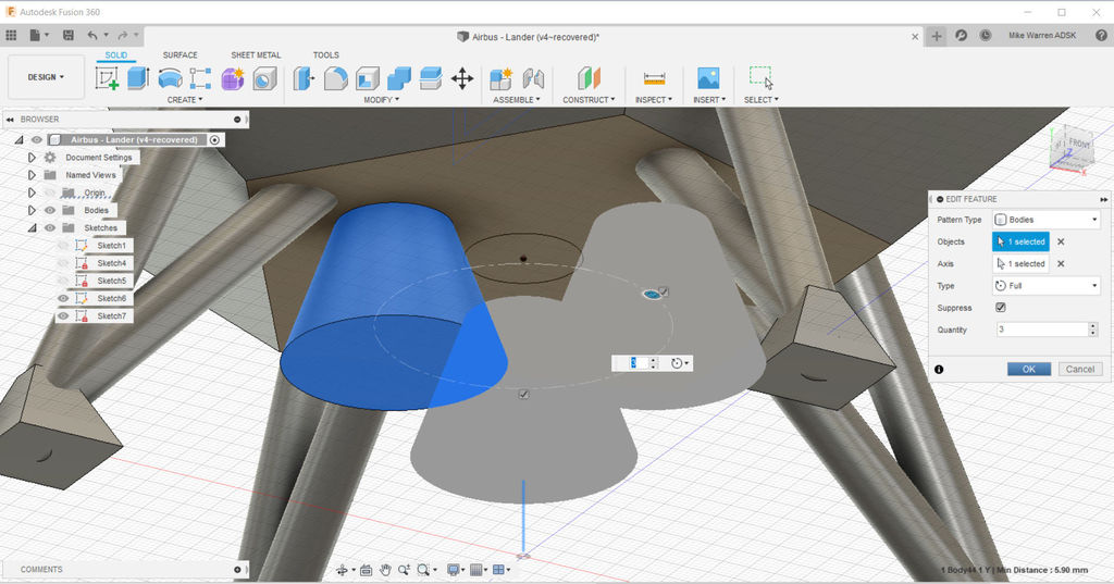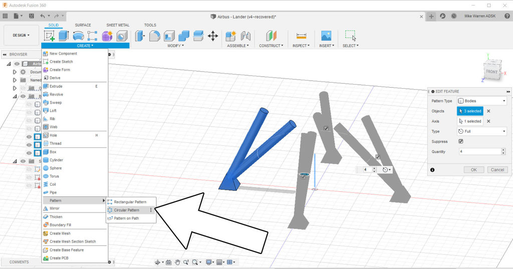 Next, we'll move the thruster body off to the side. Select the thruster body and create > circular pattern to create 2 more thrusters, using the center of the Lander as your axis point. Click OK to finish the command.