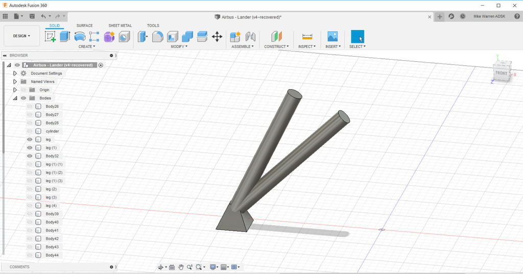 Pausing here to see where our design is at. With the bodies visible in the directory tree on the left I can move bodies around to here they need to be in relation to each other.