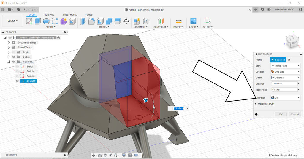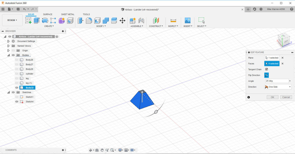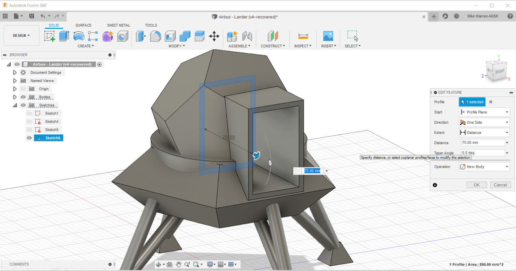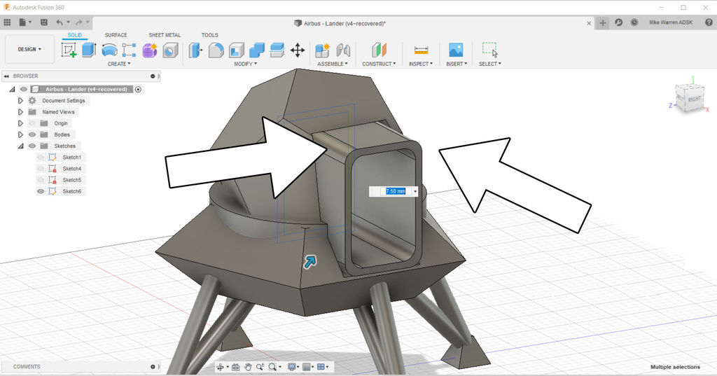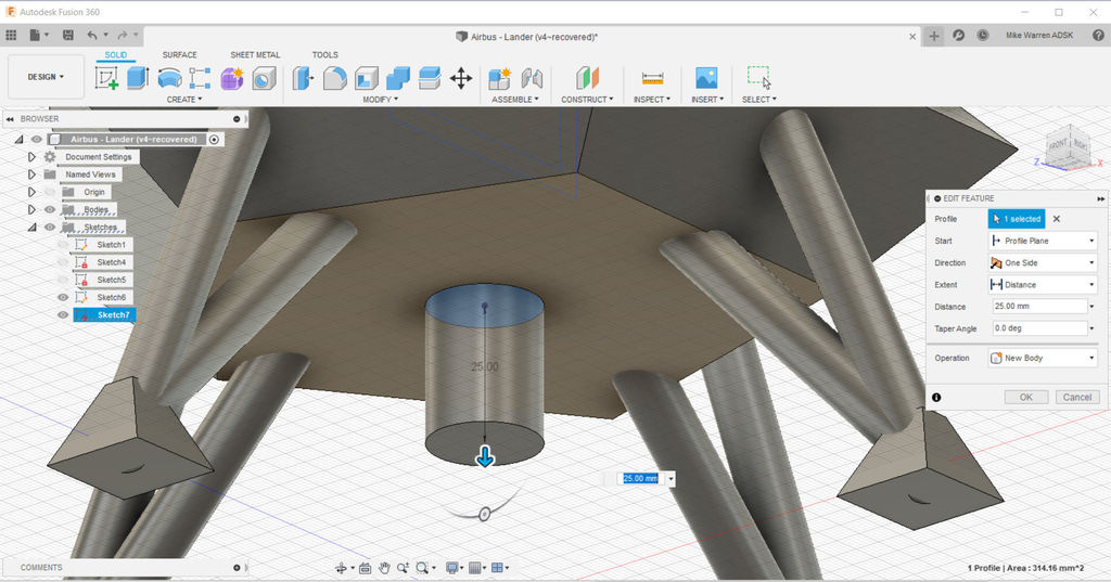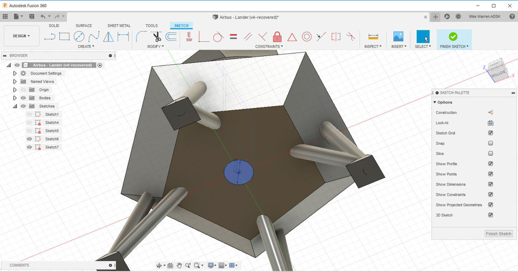 To make the thrusters I started another new sketch and selected the bottom of the lander for the sketch surface.