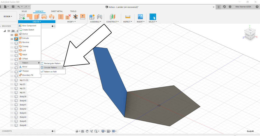 With one landing leg complete we can create > circular pattern to make the remaining legs. I used the origin point vertical axis on the workplane to array my legs around. simply move your model off to the side if your legs are too close to the origin point.