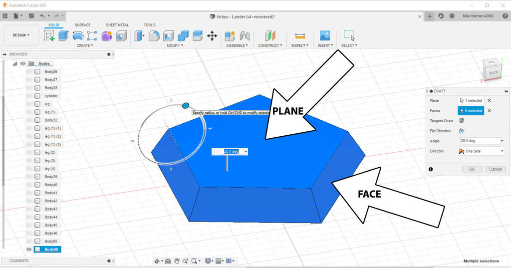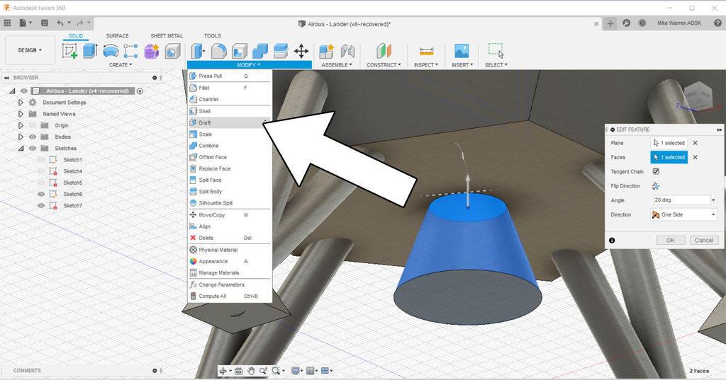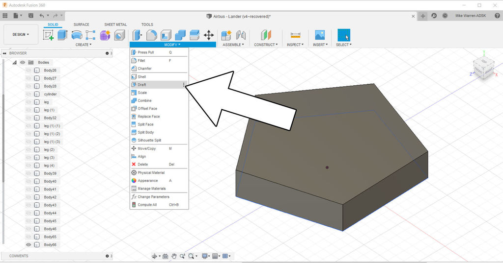 We want to add a taper around this body to give sloped sides to our Lander. For that we'll use modify > draft command.