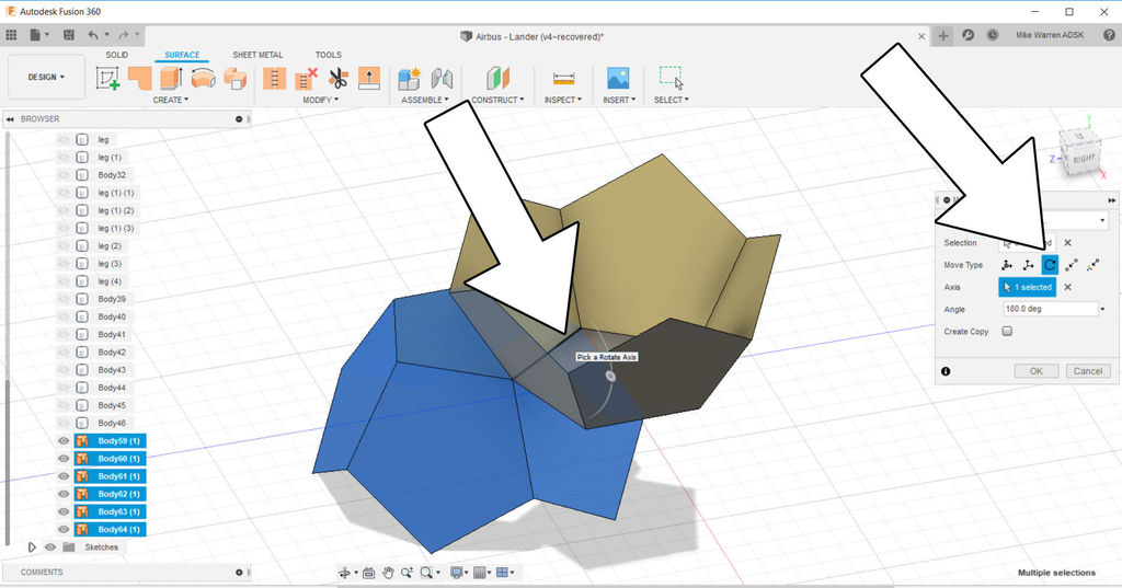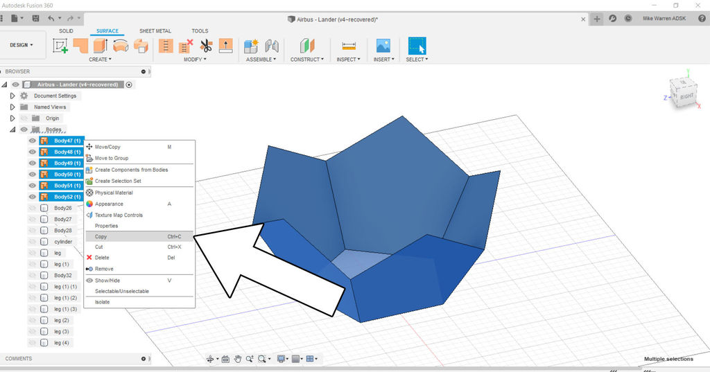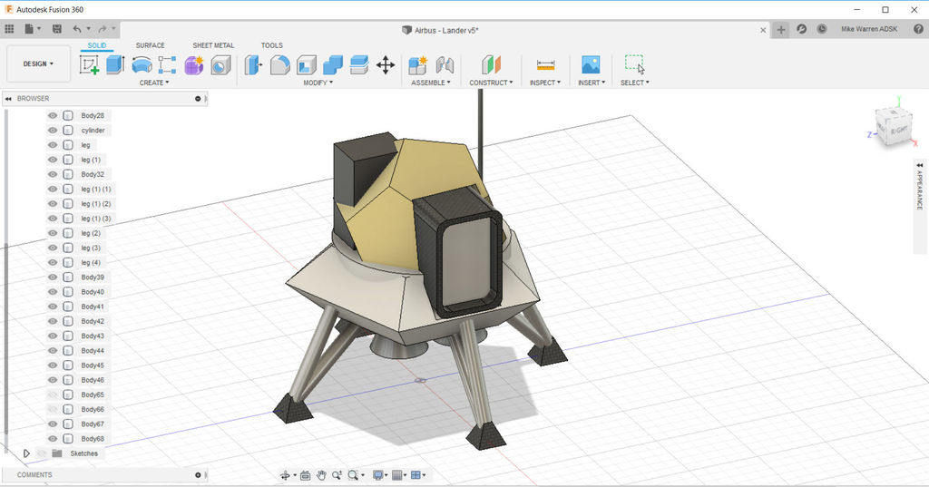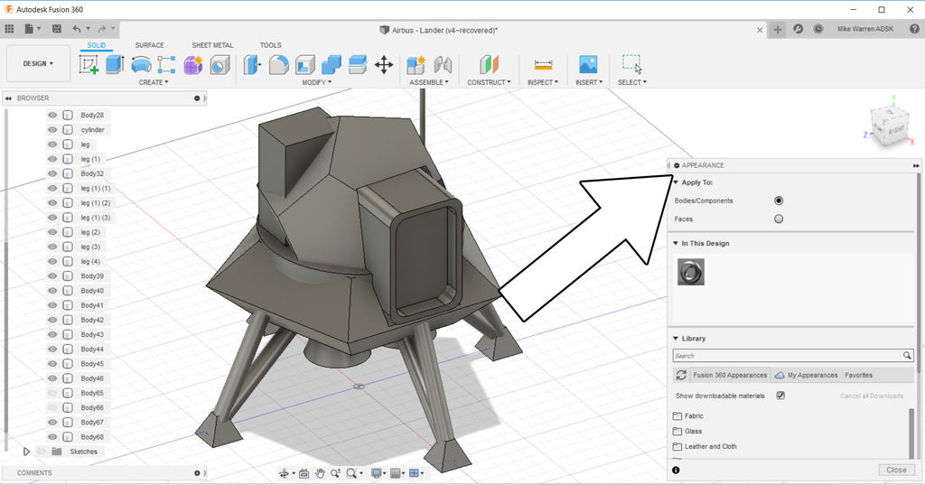 The last step is to apply some appearance colors to your model and tell the story of your Moon Lander. By not combining our bodies or joining them together, we have the option of coloring each component separately.