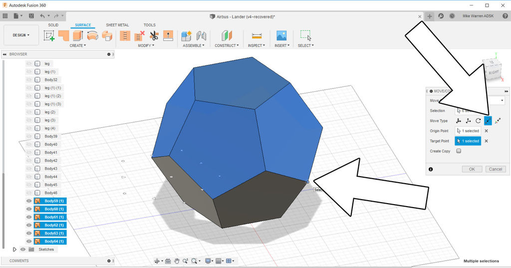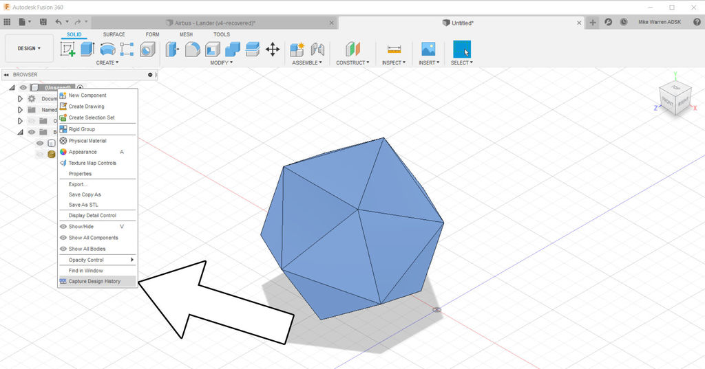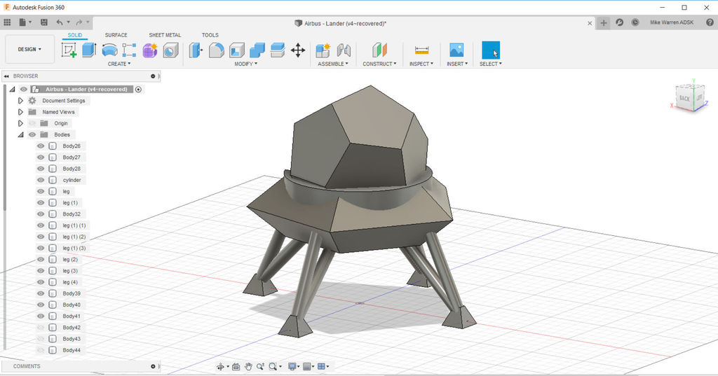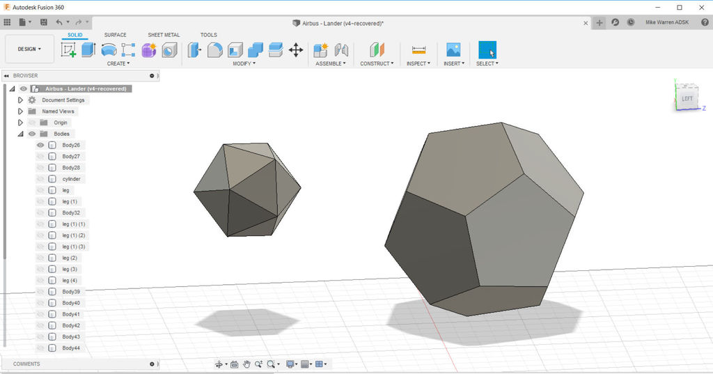 You now have a polyhedron made in Fusion 360. Switch back over to the solid tab to see the body in the left side directory. We will use this as the capsule for our Moon Lander.