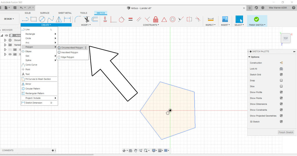 Start a new sketch and use the floor plane as our sketch surface. Go create > polygon > circumscribed polygon. Make your polygon any size you wish and finish the sketch.