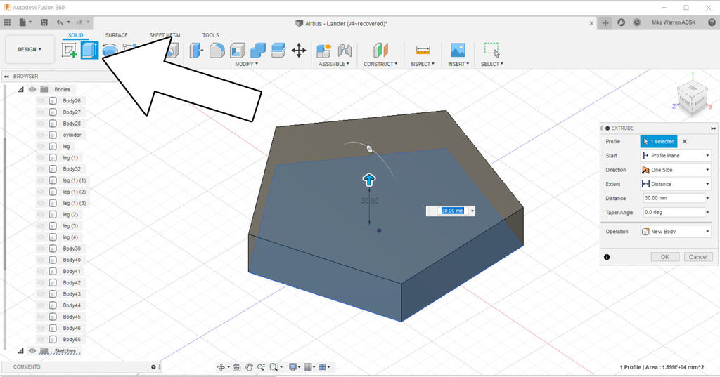 Using the same sketch geometry that we built the polyhedron from, we can extrude a new body from that sketch.