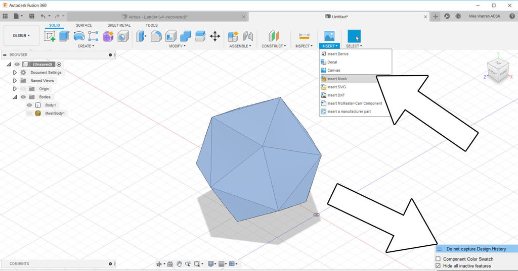 Once design history is turned off, in the top toolbar find insert > insert mesh. Then, find your STL file saved from before and select it to insert into the design.
