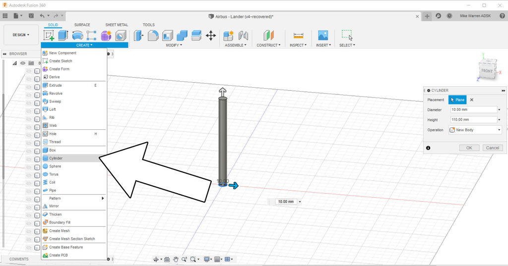 To make the landing struts I used create > cylinder and created a circle on the floor plane about 10mm in diameter and then stretched it so it was tall. If you're not happy with the sizing there's a tool in modify > push/pull that will allow you to click on a shape face and push or pull it to make it the right size.