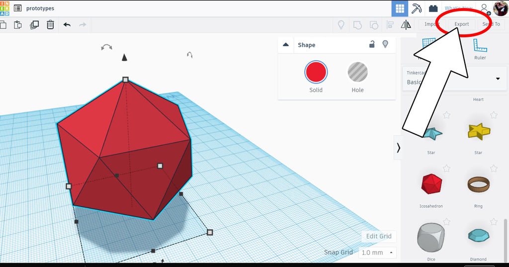 Drop that shape into the workplane. Select the shape and then use export on the top right of the screen to export the shape as an STL file. remember where you saved this file on your computer.