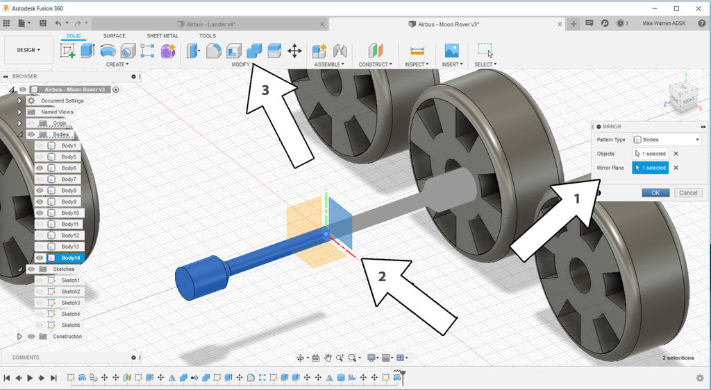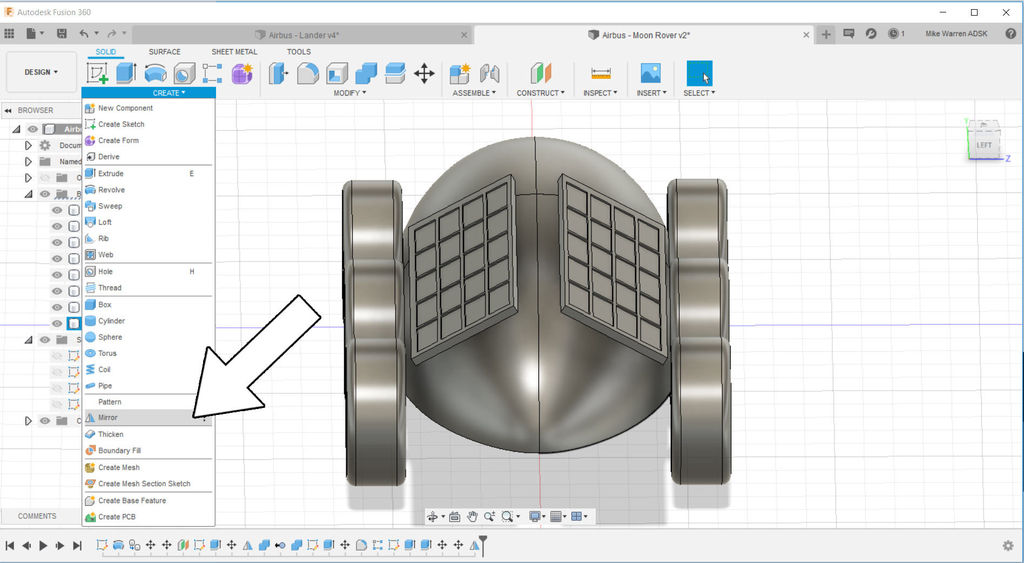 Since the wheels I made are symmetrical the rectangular pattern was a good choice. If your wheels are different on both sides you can do the rectangular pattern command on one side, then try the mirror command to flip a copy onto the other side of the Rover.