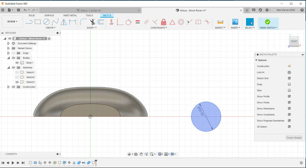 Start a new sketch and use the offset plane on the nose of the Rover as your plane. On the nose draw a small circle, this circle will be used as the shape for our appendage. Click finish sketch to complete this step, we'll make the appendage next using the circle as our shape guide.
