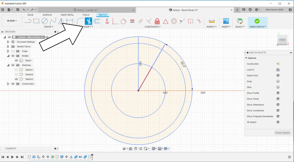 Sketch a circle, which can be found under create > circle or by using the shortcut key C. Draw a circle the diameter of your wheel, using the Rover body for scale. Draw a few more concentric circles to build up the wheel geometry (see image below).