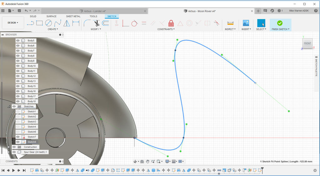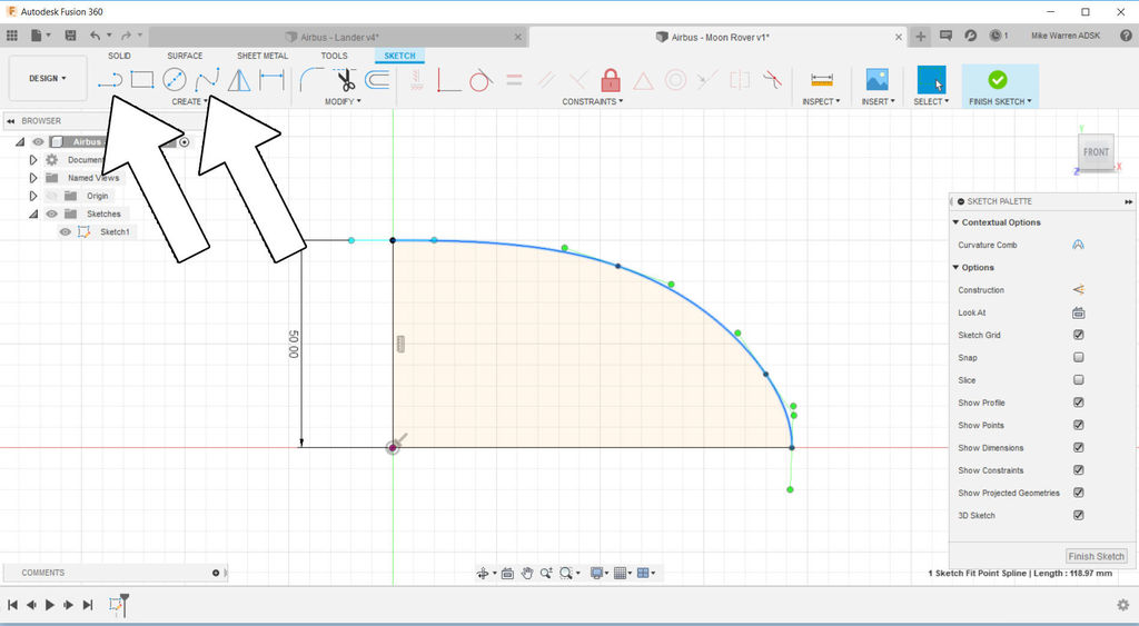 Start another new sketch on the profile of the Rover and create > spline to make an appendage profile extending from the nose of the Rover. When you're satisfied with your spline shape click finish sketch to return to the model environment.