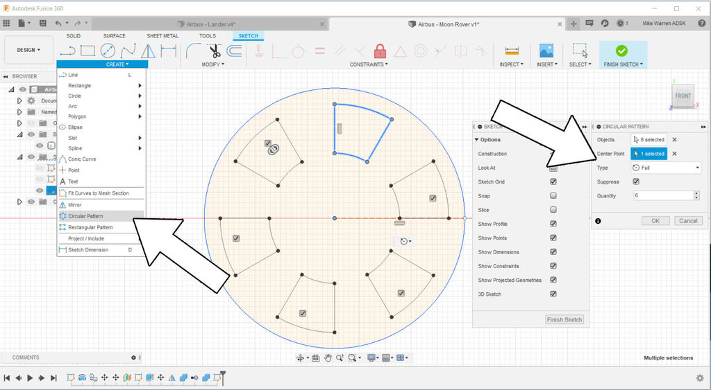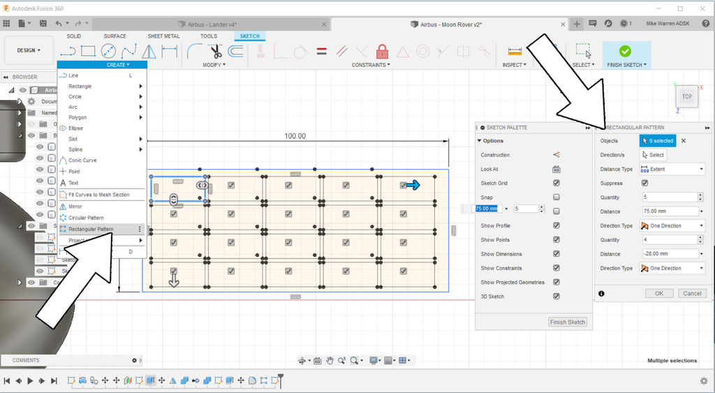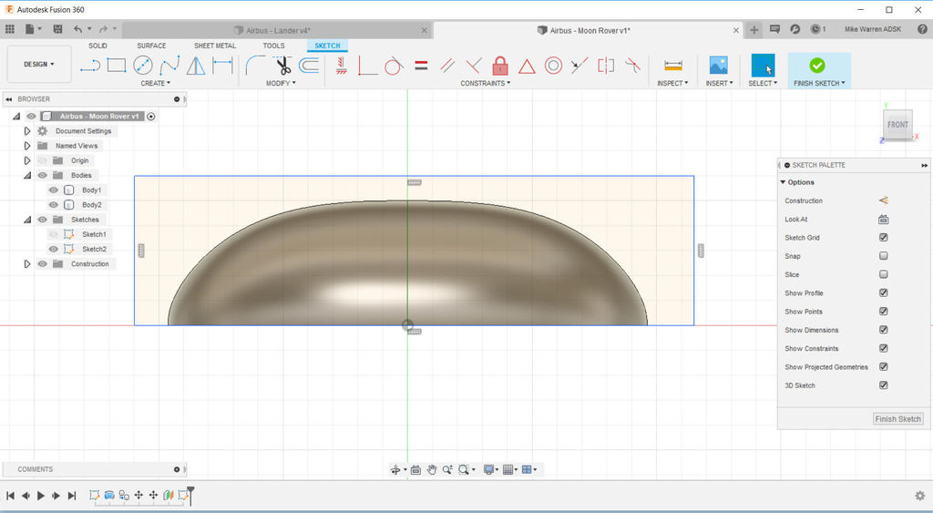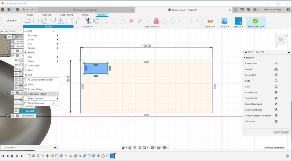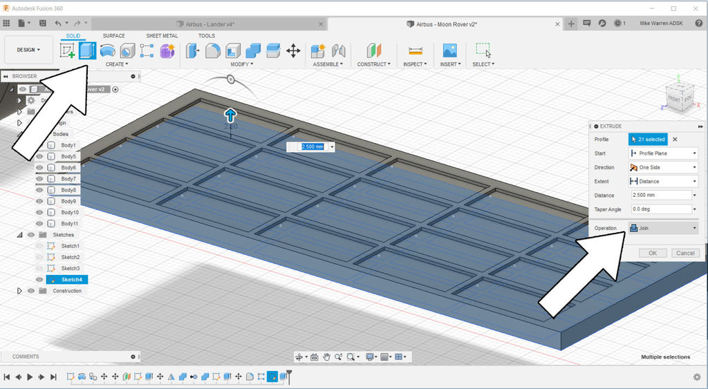 This Rover uses solar panels on the back to stay charged. To make these panels I started a new sketch, using the ground/floor as my workplane.