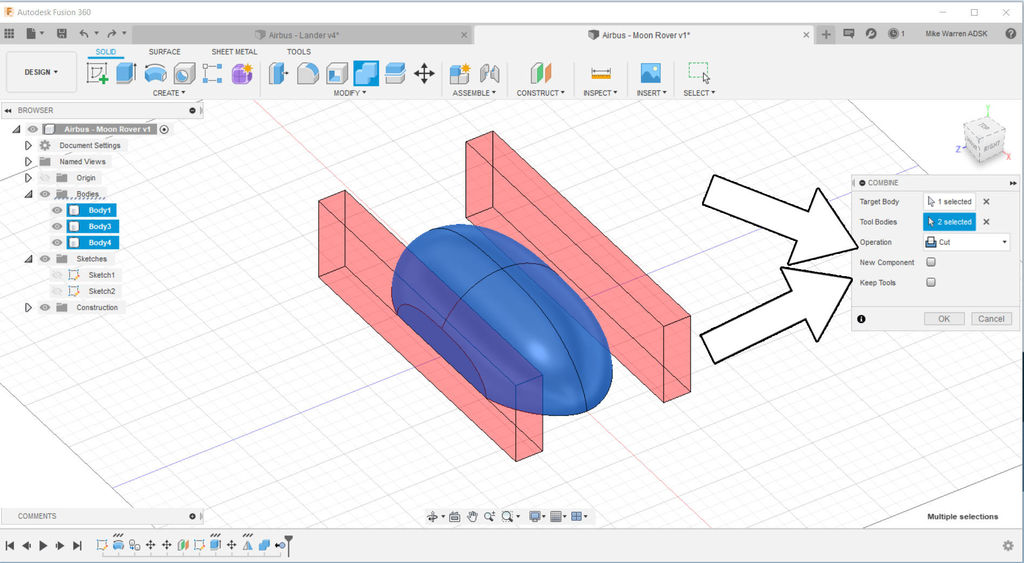 This operation lets us determine which body to keep (the target) and which bodies to use as the removal (tool bodies). Select the Rover shape as the target, and both rectangles as the tool bodies. In the dropdown we want to use the cut operation to cut into our target shape.
