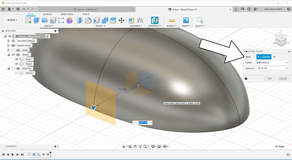 The offset menu lets us chose which plane to use as the offset, and the distance away from the plane we want the offset to be. I chose a distance that was a little outside the edge of the Rover. Click OK to finish the command.