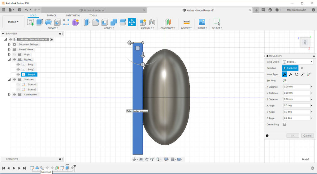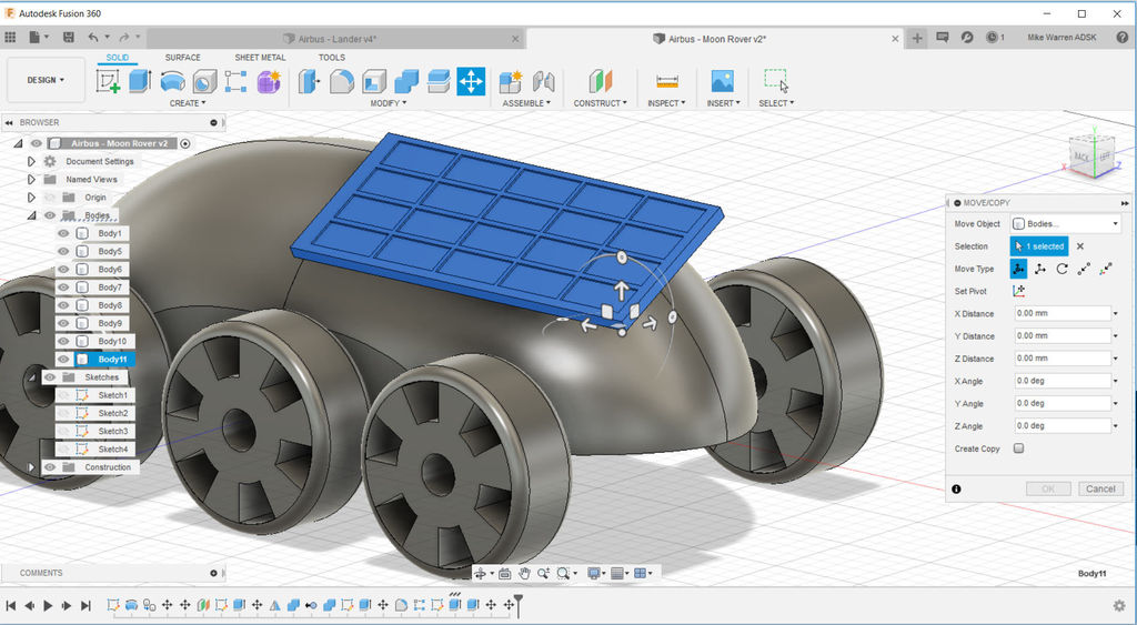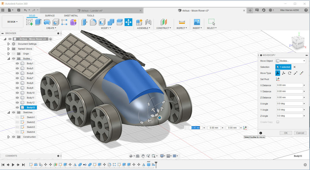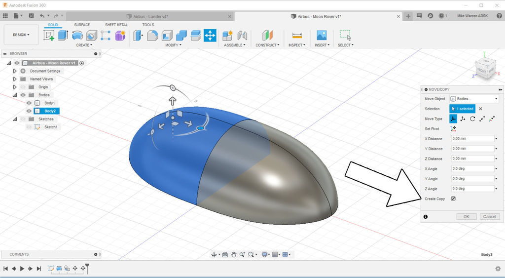 This is only half the Rover body. To create the other half we can select the body (likely Body 1 in your design) and then find the move command located in modify > move/copy, alternatively you can press M on your keyboard as a shortcut. In the move/copy menu ensure the create copy button is selected.