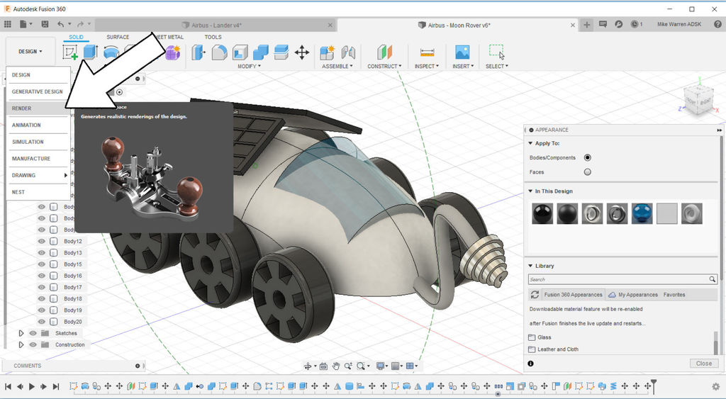 After applying materials we can render our model and see what it might look like outside of the CAD interface (without the grid background and all the toolbars). On the far left side of the screen you can see DESIGN, which is the workspace we've been working in. Click that to open a table of other workspacesand find RENDER.