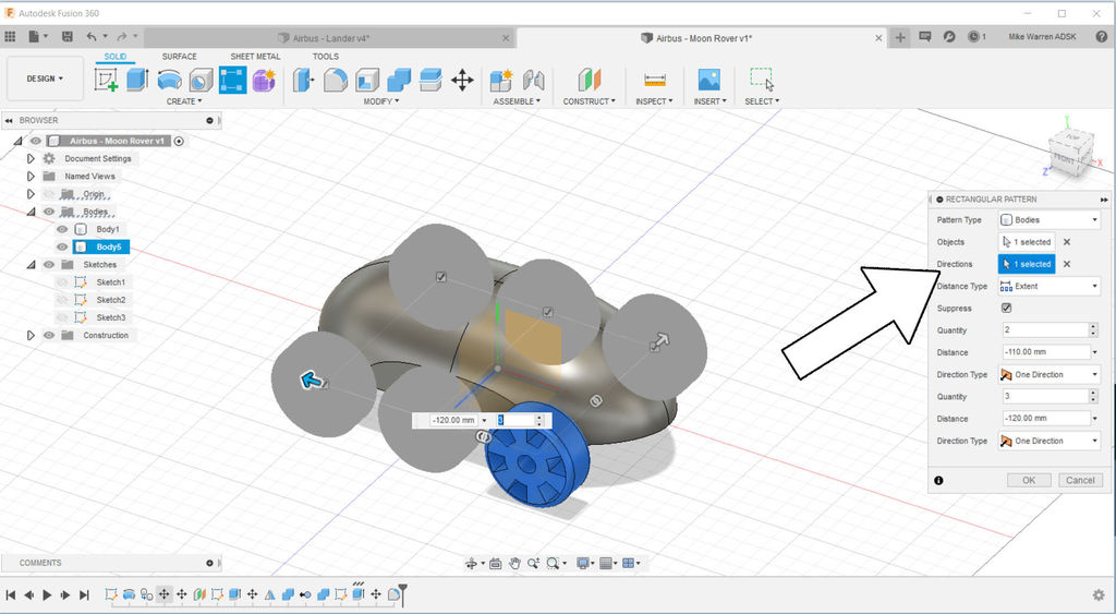 With the wheel in position we will use the create > rectangular pattern tool to make an array around our Rover. In the rectangular array menu you can specify the number of wheels, and the distance apart on each axis.
