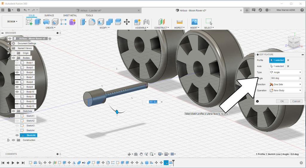 Use your sketch as the profile and then set your angle to 360°. Chose the new body operation and then click OK to complete the action.