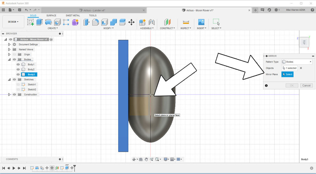 We'll make an exact copy of this rectangle so we can shave off the other edge. Find the mirror tool in create > mirror and use the center line of the Rover body as the mirror plane. Pressing OK will finish the command and create a copy mirrored on both sides of the Rover body.