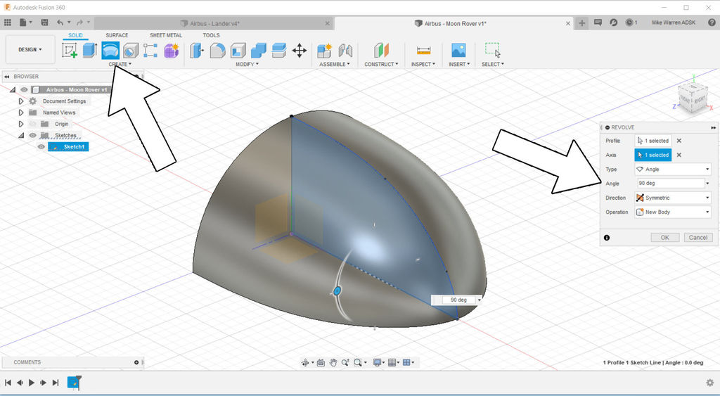 We want this sketch to be revolved around an axis to create the shape. Find the revolve command and chose the sketch as the profile. In the revolve menu that pops up you can select which axis to revolve around, the angle to revolve, and the direction (one side or symmetrical). For this model we want to revolve around the bottom axis, 90 degrees and symmetrical, which will do 90 degrees on both sides of the sketch. Click OK to finish the command.