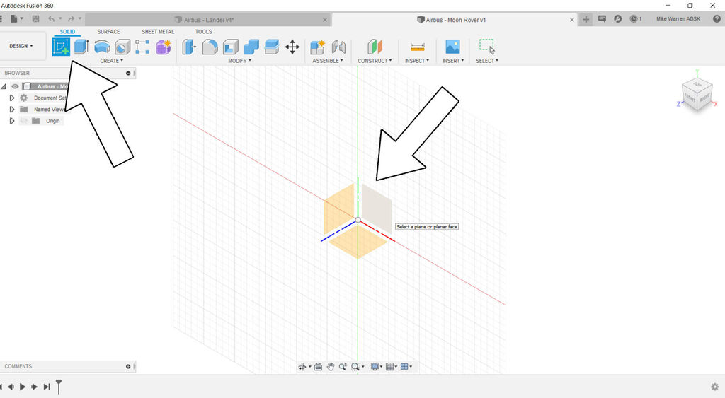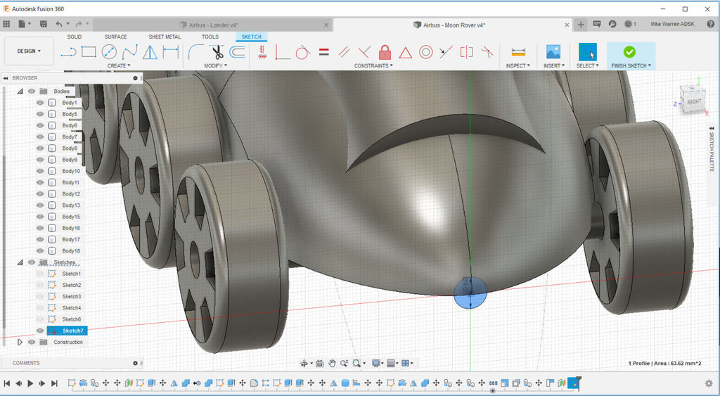 With the Rover body finished we can turn to designing the wheels. Start a new sketch using the same plane as before to make the Rover body.