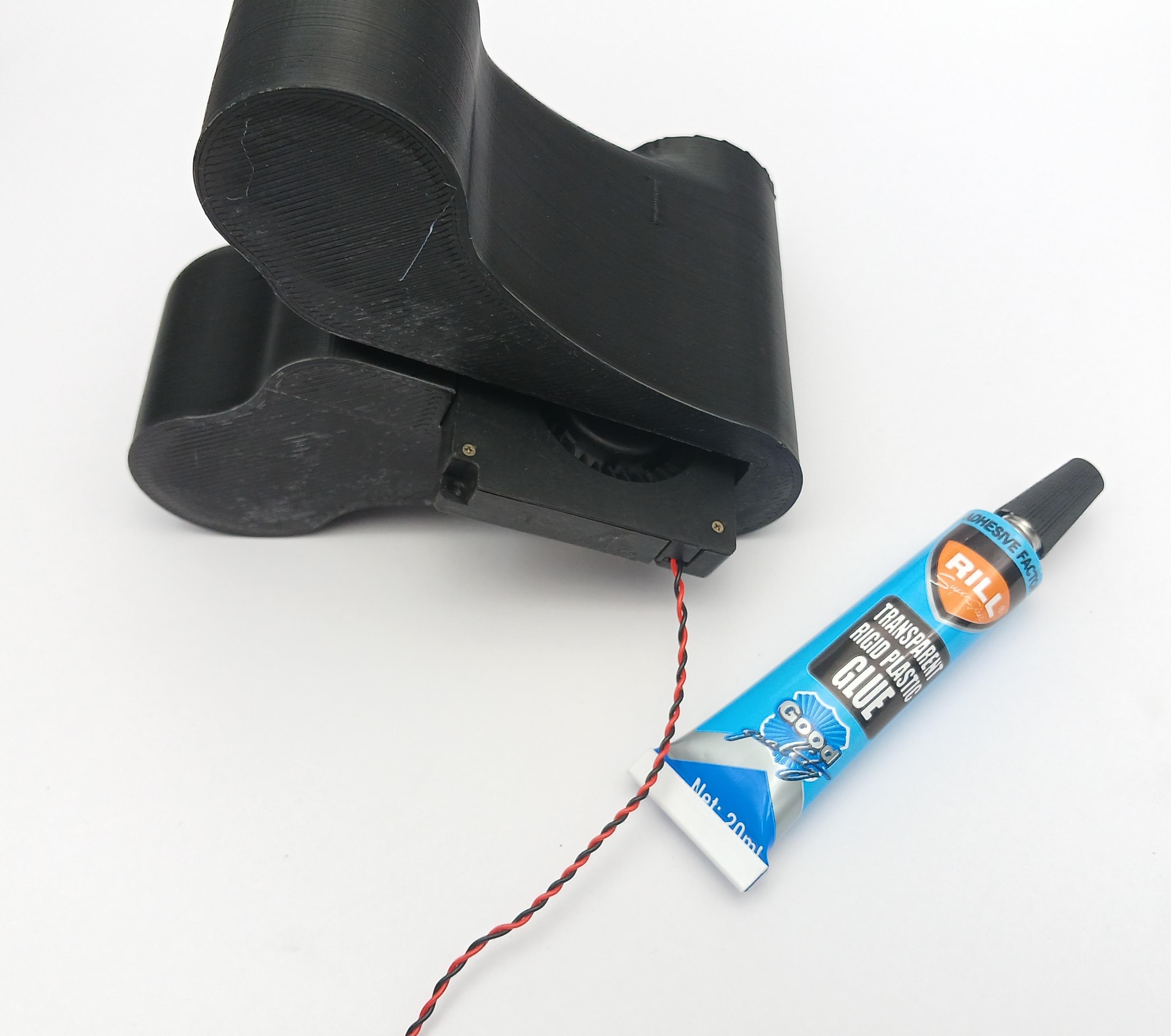 I started assembly by applying a few small dots of adhesive on the back of the blower fan and sliding it into its slot in the bottom of the base. The wire of the blower fan is fed through the air outlet hole into the reflector.
