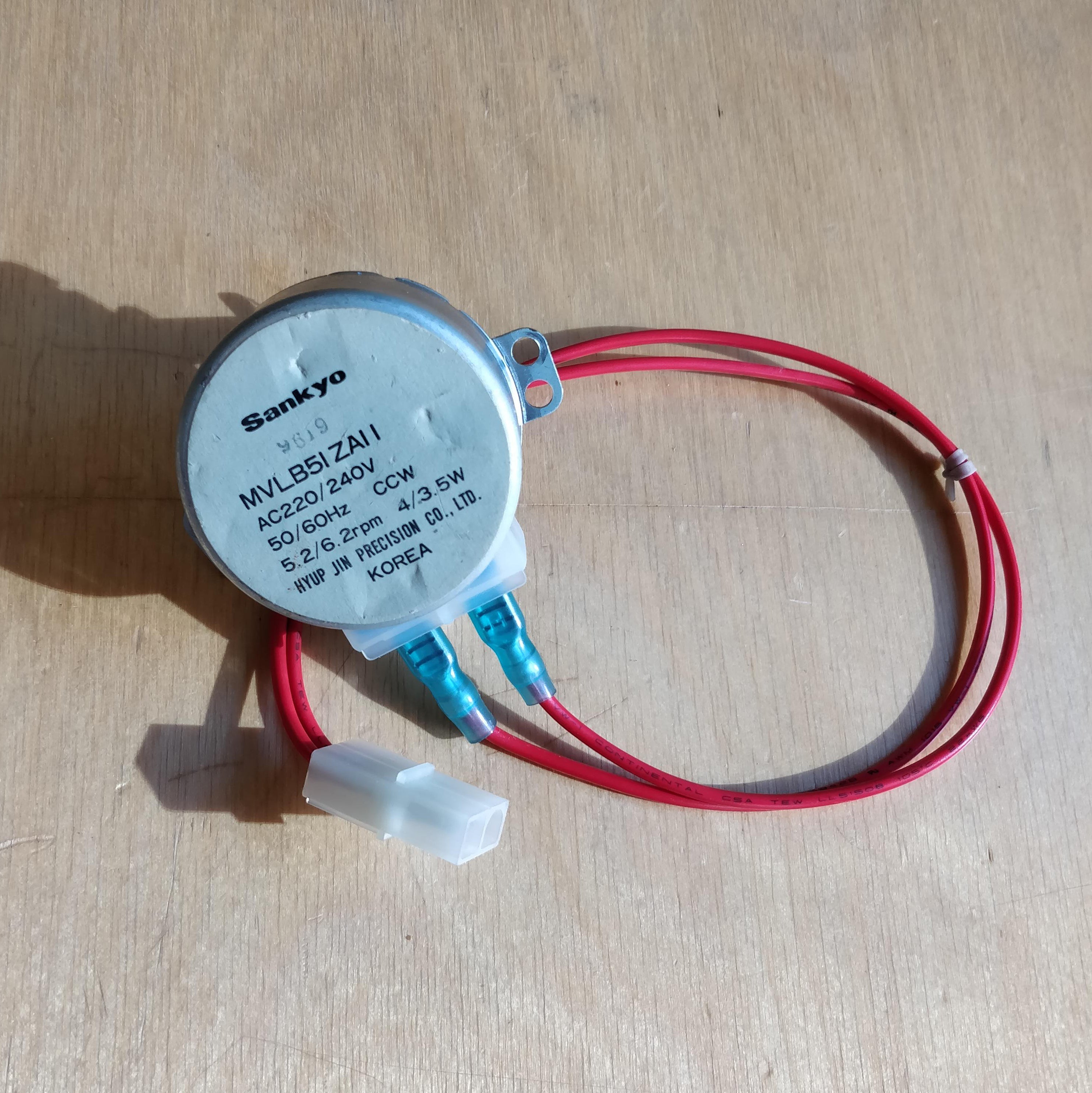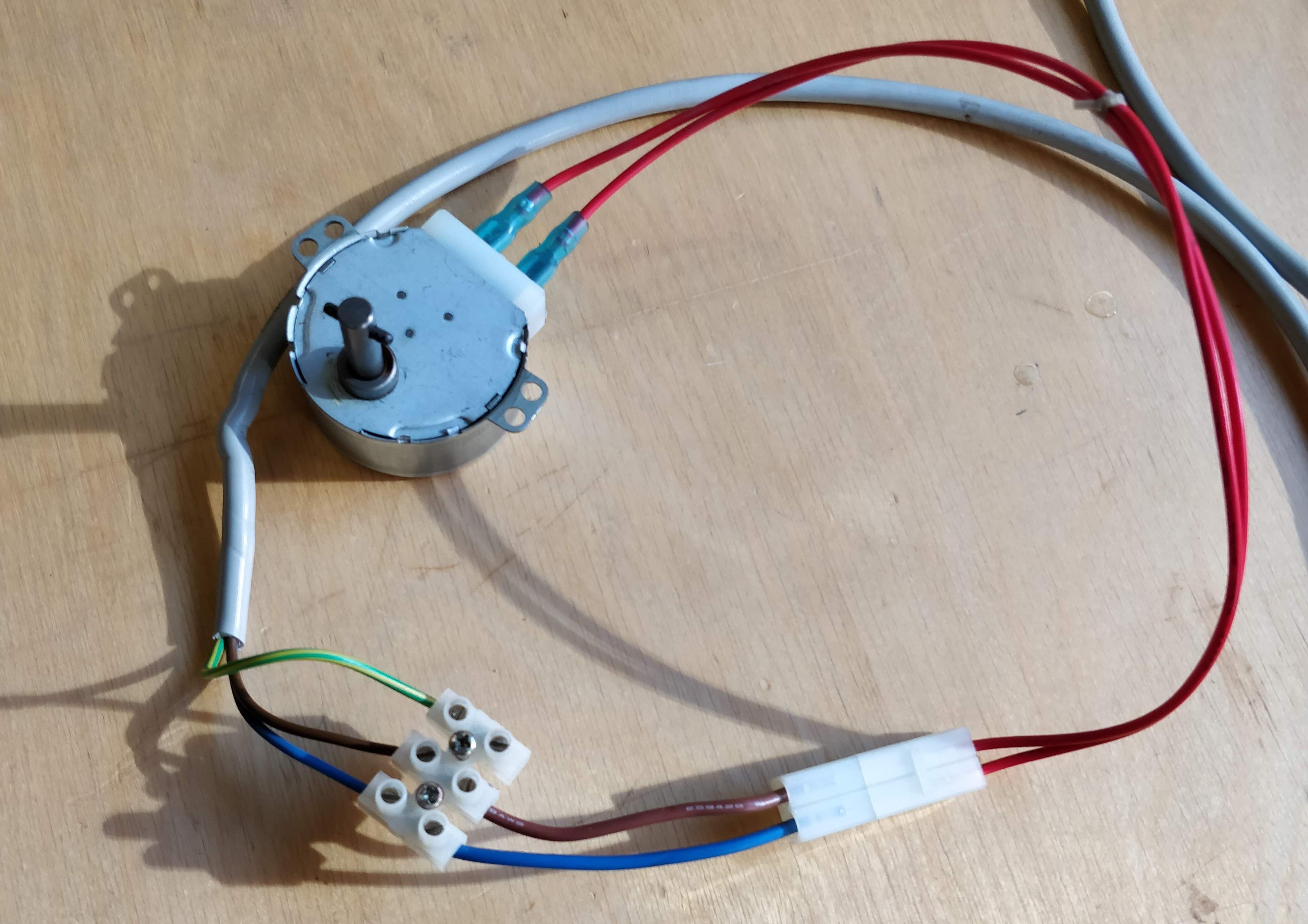 Luckily we have a microwave at our disposal. Which happens to have a power cable. So lets use this cable directly and connect this to our motor. As far as I can tell, it is not possible to reuse these transparent white connectors. By pulling the cables out and put new ones in. But if you are just as lucky as I am. You'll find one of these standard electrical connectors in your microwave which you can use for this purpose.