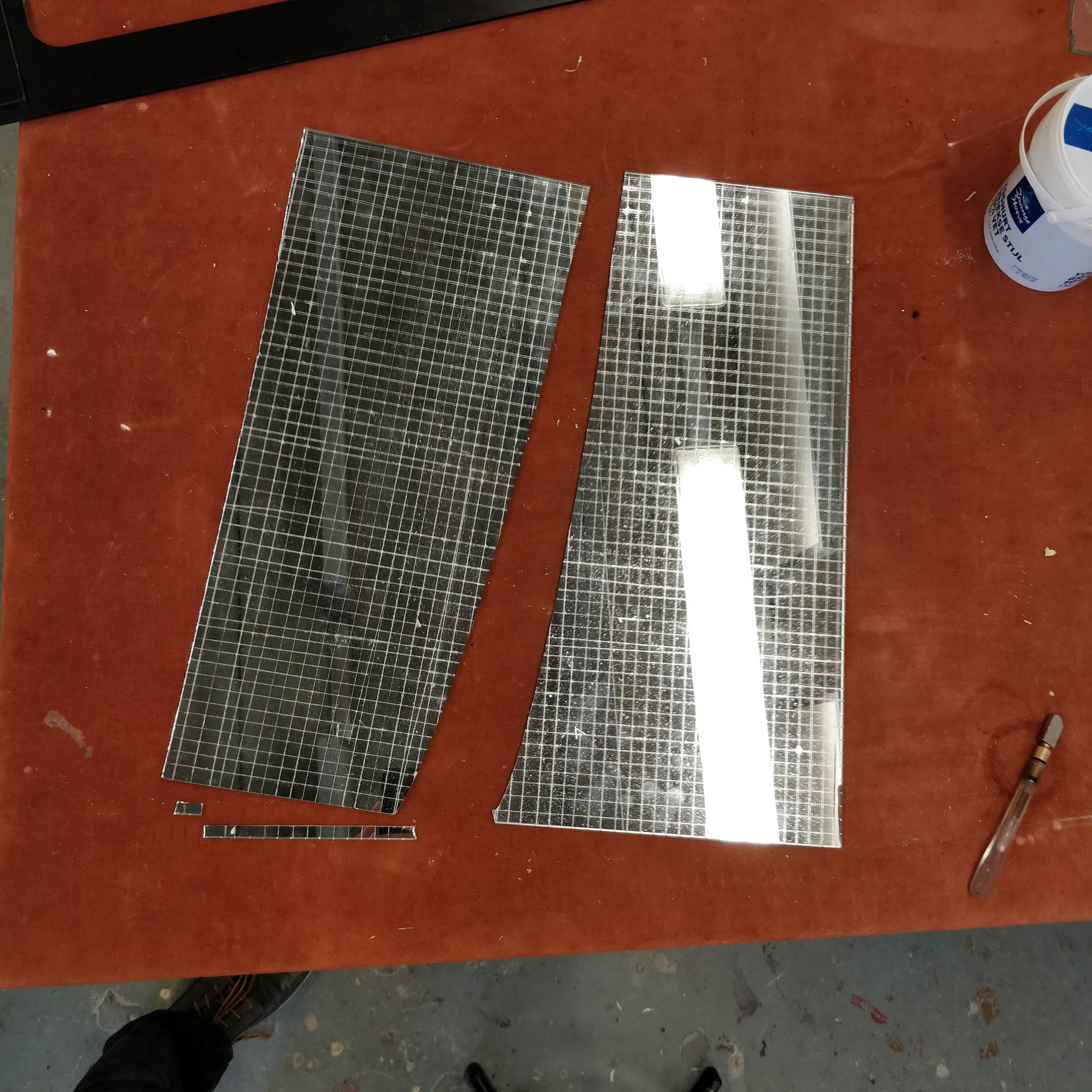 Before we can get this party we need to prepare. In this case, that means we need to cut our mirror into tiny pieces. The bad part of this is that this is really time consuming and very boring thing to do. The good part is, that this doesn't have to be done very precise. Ofcourse, the more precise you are. The better the outcome. But in practice it does not really matter that bad. As a matter of fact. It comes in really handy when you accidentally crack a piece diagonally, since these parts will become useful when you are working on the curved sections of your object.